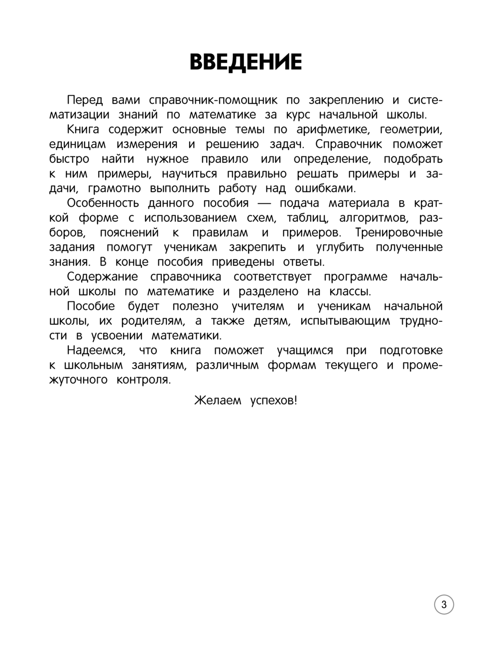 Справочник содержит обширный материал по математике за курс начальной школы. Ученик найдёт здесь краткое объяснение основной информации по предмету и примеры выполнения заданий. Материал подаётся в удобной форме с применением схем, таблиц, алгоритмов и пояснений к правилам. В конце пособия приведены ответы. Тренировочные задания помогут школьнику закрепить и углубить полученные в школе знания. Пособие разработано с учётом требований ФГОС начального общего образования.