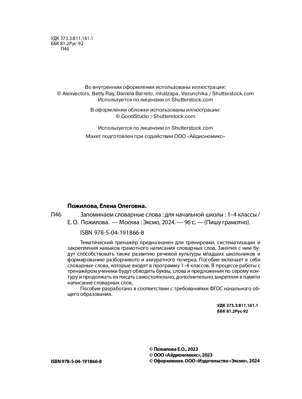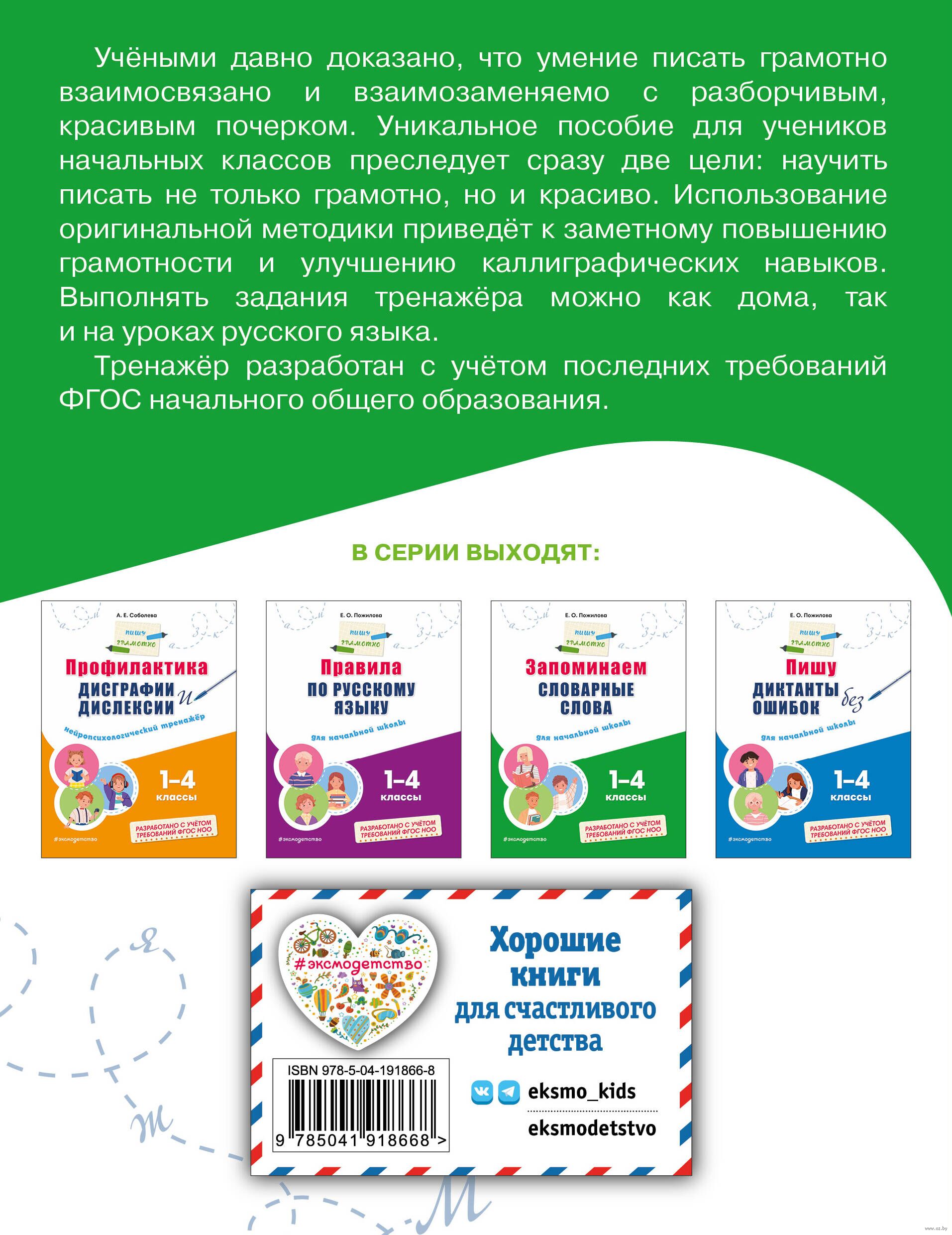 Тренажёр помогает решить важнейшую задачу, стоящую перед учениками начальной школы – запомнить все словарные слова, изучаемые в 1-4 классах. Задания данного пособия помогут детям систематизировать знания, полученные на уроках русского языка, и развить свою речевую культуру. Тренажёр можно использовать как дома для совместной работы учеников и взрослых, так и в школе в качестве дополнительного материала.