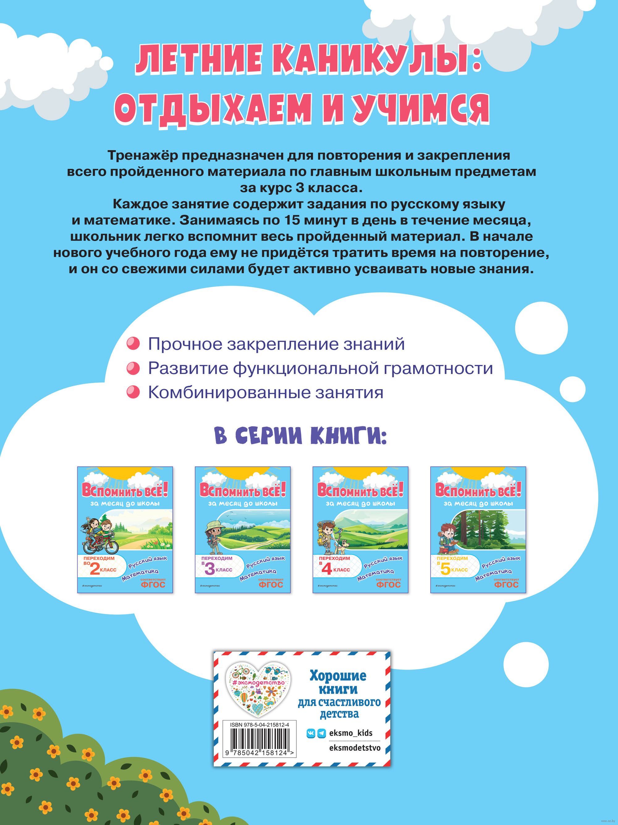 Тренажёр для учеников начальной школы предназначен для повторения и закрепления всего пройденного материала за курс 3 класса. Пособие состоит из 30 комбинированных занятий, каждое из которых включает в себя два задания по русскому языку и два задания по математике.