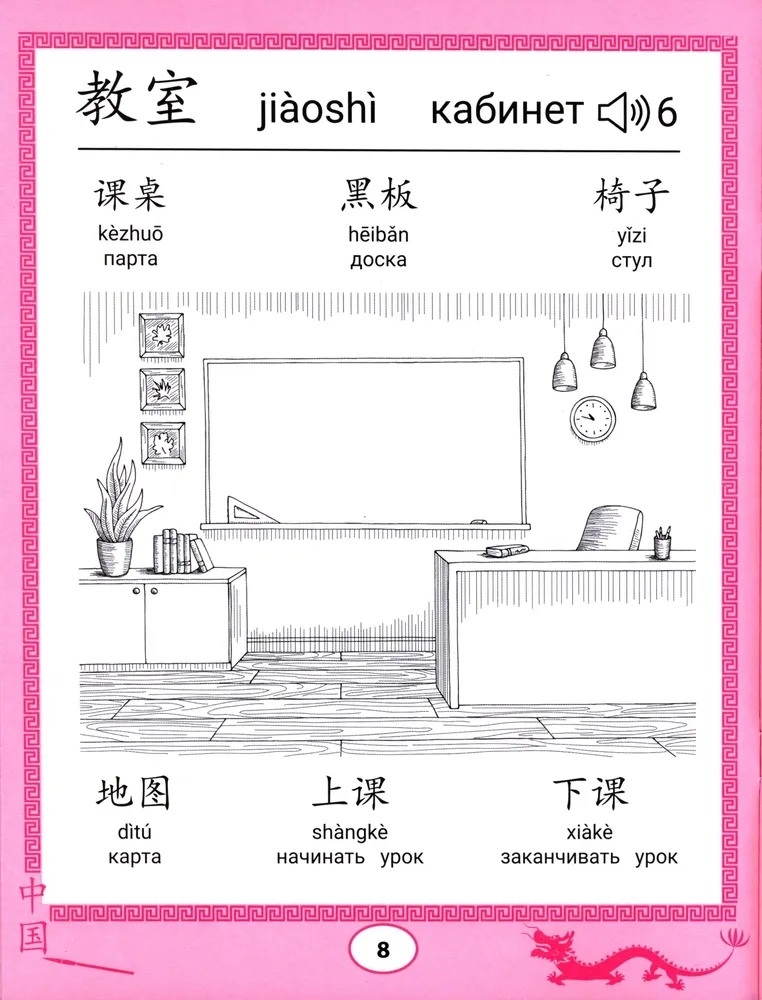 Ребёнок и его родители смогут совместно выучить основные слова, описывающие школьную деятельность и окружающие школьника предметы. Картинки-раскраски подскажут, какие предметы можно описать новыми словами, аудиоприложение научит правильному произношению, а лёгкие прописи помогут быстрее запомнить иероглифы и научиться их писать.