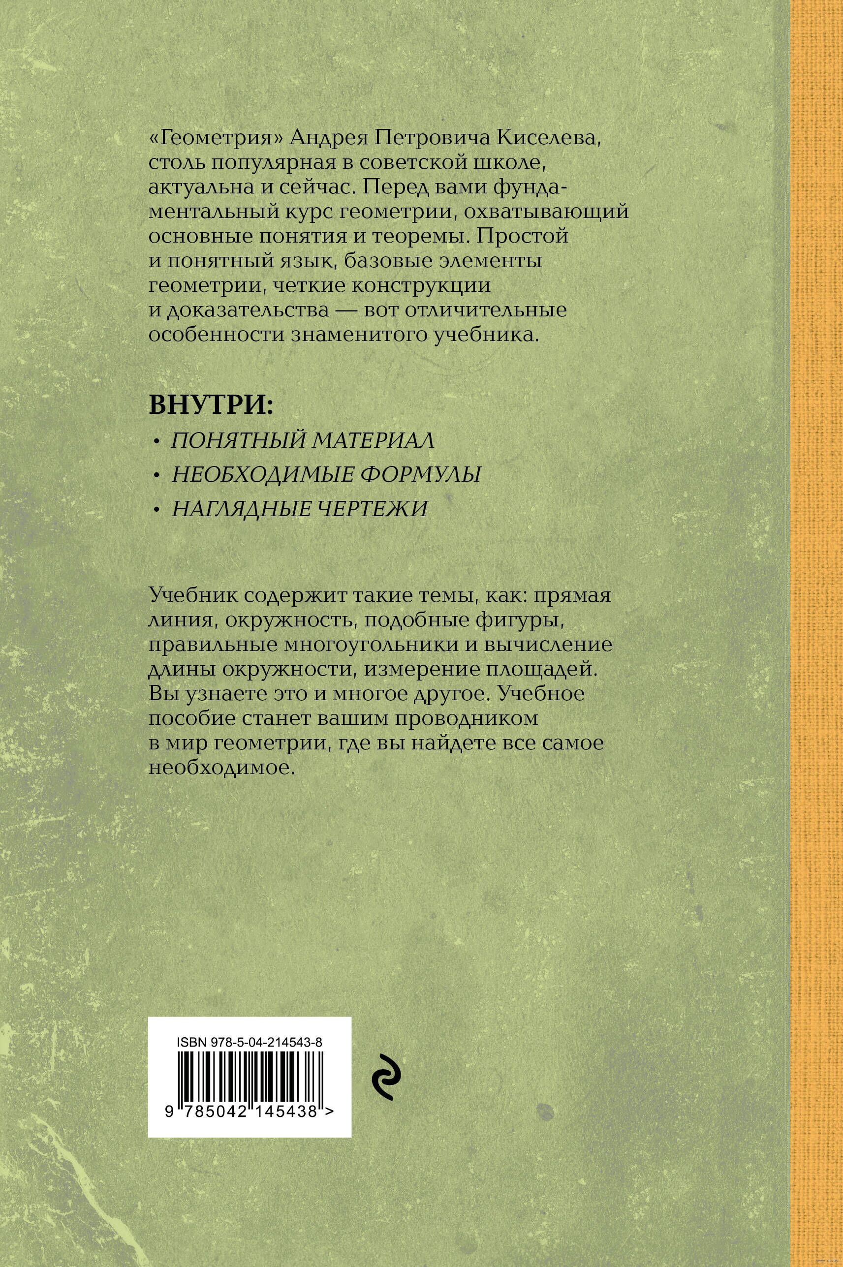 Знаменитый учебник по геометрии математика А.П. Киселева любим многими поколениями. В нем вы найдете все необходимое: от формул до подробных чертежей. Учебное пособие поможет подготовиться не только к экзаменам, но и разобраться в сложных темах для общего развития. В книге подробно и доступно раскрыты темы окружностей, подобий треугольников, измерение площадей и многие другие. Учебник Андрея Петровича Киселева незаменим в качестве учебного пособия для школьников и всех любителей математики в целом.
