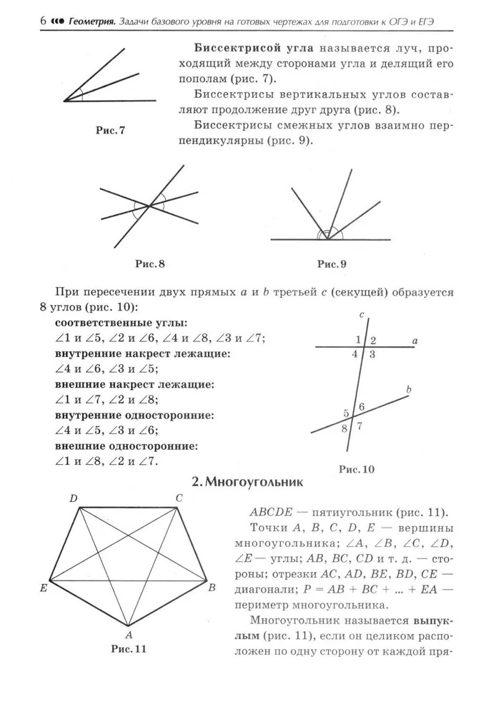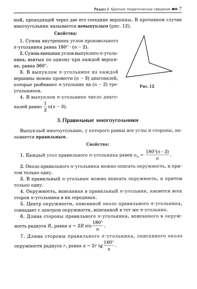 Кроме того, в пособии приводятся краткие теоретические сведения по курсу геометрии 7-9 классов, сопровождаемые определениями, теоремами, основными свойствами и необходимыми справочными материалами. К наиболее трудным задачам даны решения и обоснования.