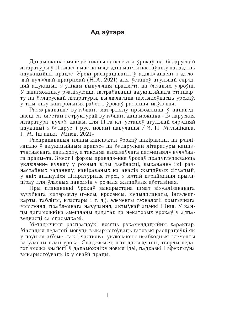 Выданне ўключае паўрочныя распрацоўкі па беларускай літаратуры для 11 класа на I паўгоддзе навучання і змяшчае 20 урокаў у адпаведнасці з вучэбнай праграмай для ўстаноў агульнай сярэдняй адукацыі з беларускай і рускай мовамі навучання. Планы-канспекты вызначаюцца актуальным афармленнем, разнастайнасцю розных прыёмаў, метадаў і форм работы на ўроках.