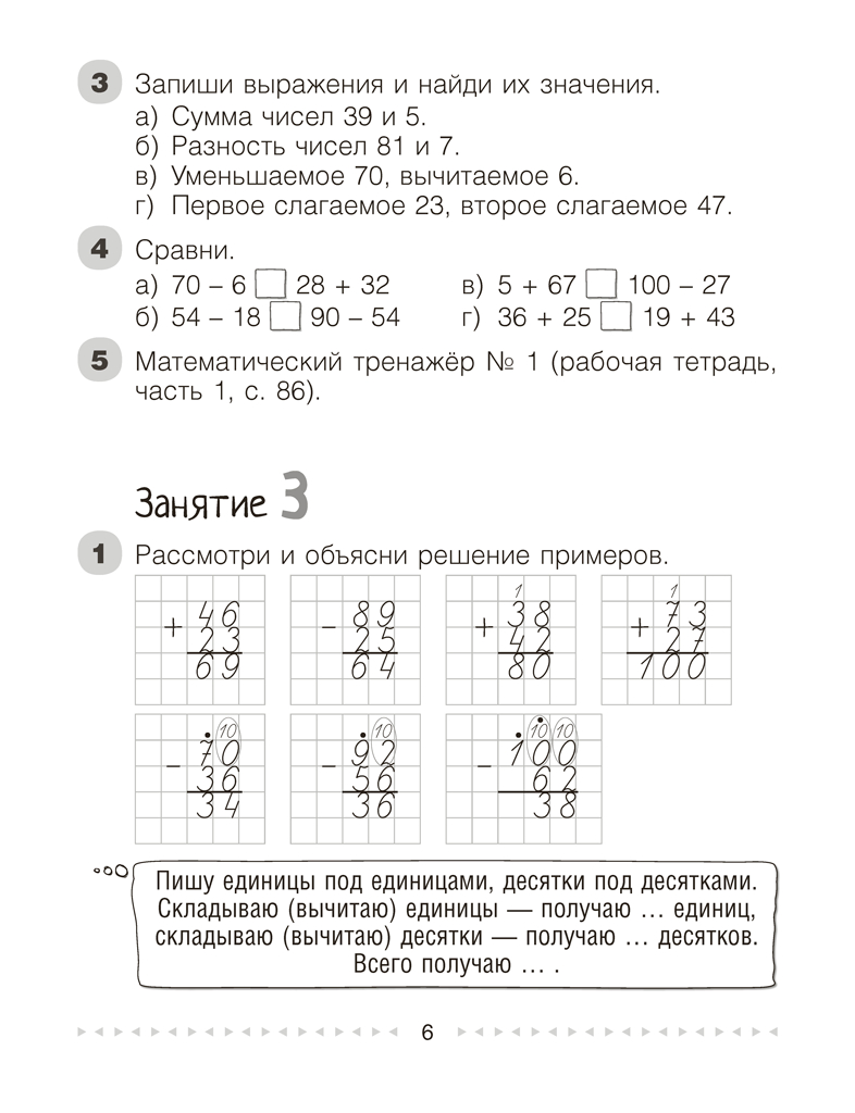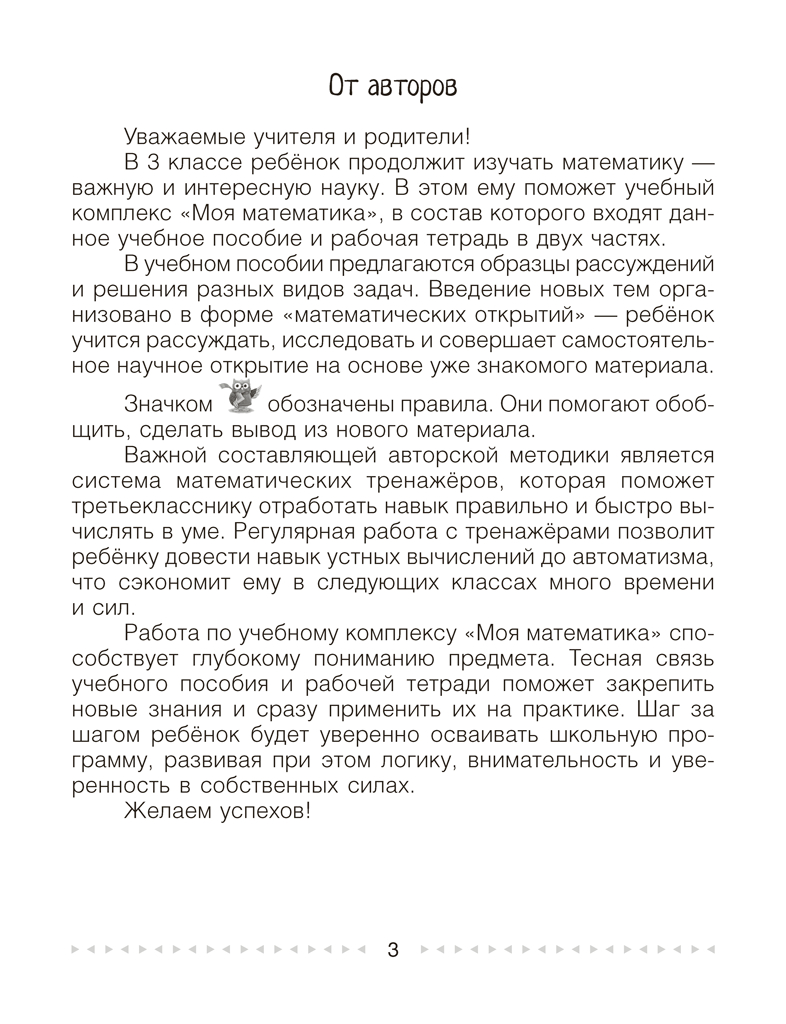 Пособие является принципиально новым по методике обучения математике в 3 классе. Оно поможет учащимся успешно усвоить материал по предмету, а учителю – эффективно организовать учебный процесс. Представленные в пособии игры и задания будут способствовать развитию у школьников памяти, логического мышления, умения быстро и правильно вычислять в уме.