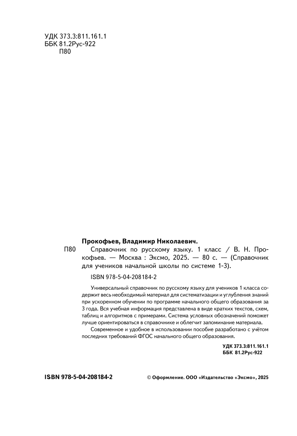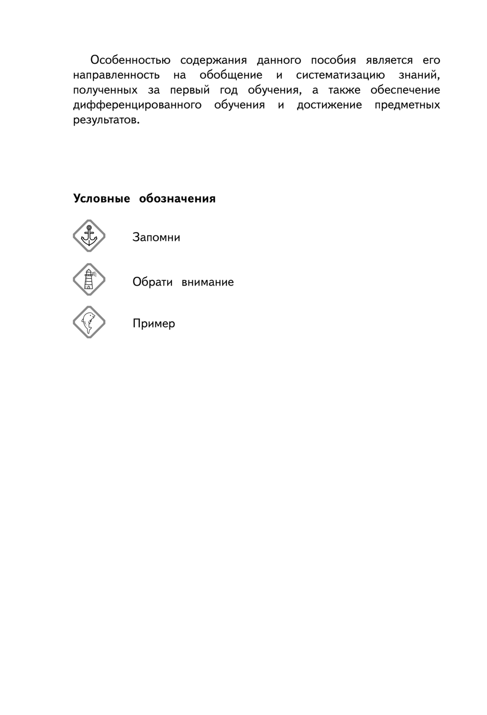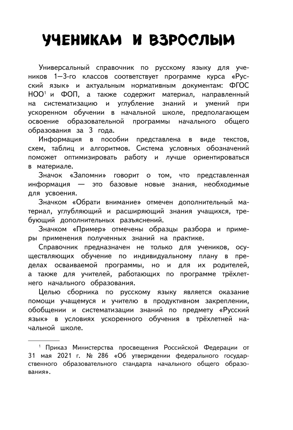 Универсальный справочник по русскому языку для учеников 1 класса содержит весь необходимый материал для систематизации и углубления знаний при ускоренном обучении по программе начального общего образования за 3 года. Вся учебная информация представлена в виде кратких текстов, схем, таблиц и алгоритмов с примерами. Система условных обозначений поможет лучше ориентироваться в справочнике и облегчит запоминание материала.