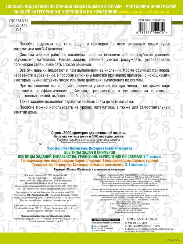 Пособие содержит все типы задач и примеров по всем основным темам курса математики для 3-4 классов. Систематическая работа с пособием позволит обеспечить более глубокое усвоение изучаемого материала.