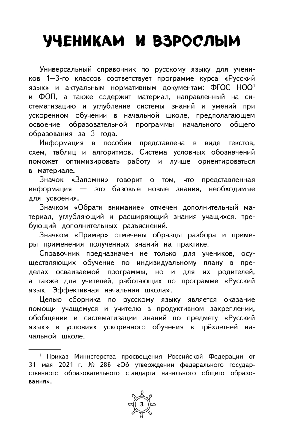 Универсальный справочник по русскому языку для учеников 2 класса содержит весь необходимый материал для систематизации и углубления знаний при ускоренном обучении по программе начального общего образования за 3 года. Вся учебная информация представлена в виде кратких текстов, схем, таблиц и алгоритмов с примерами. Система условных обозначений поможет лучше ориентироваться в справочнике и облегчит запоминание материала.