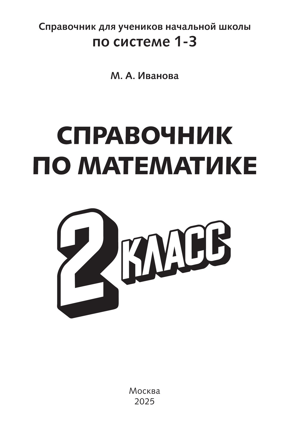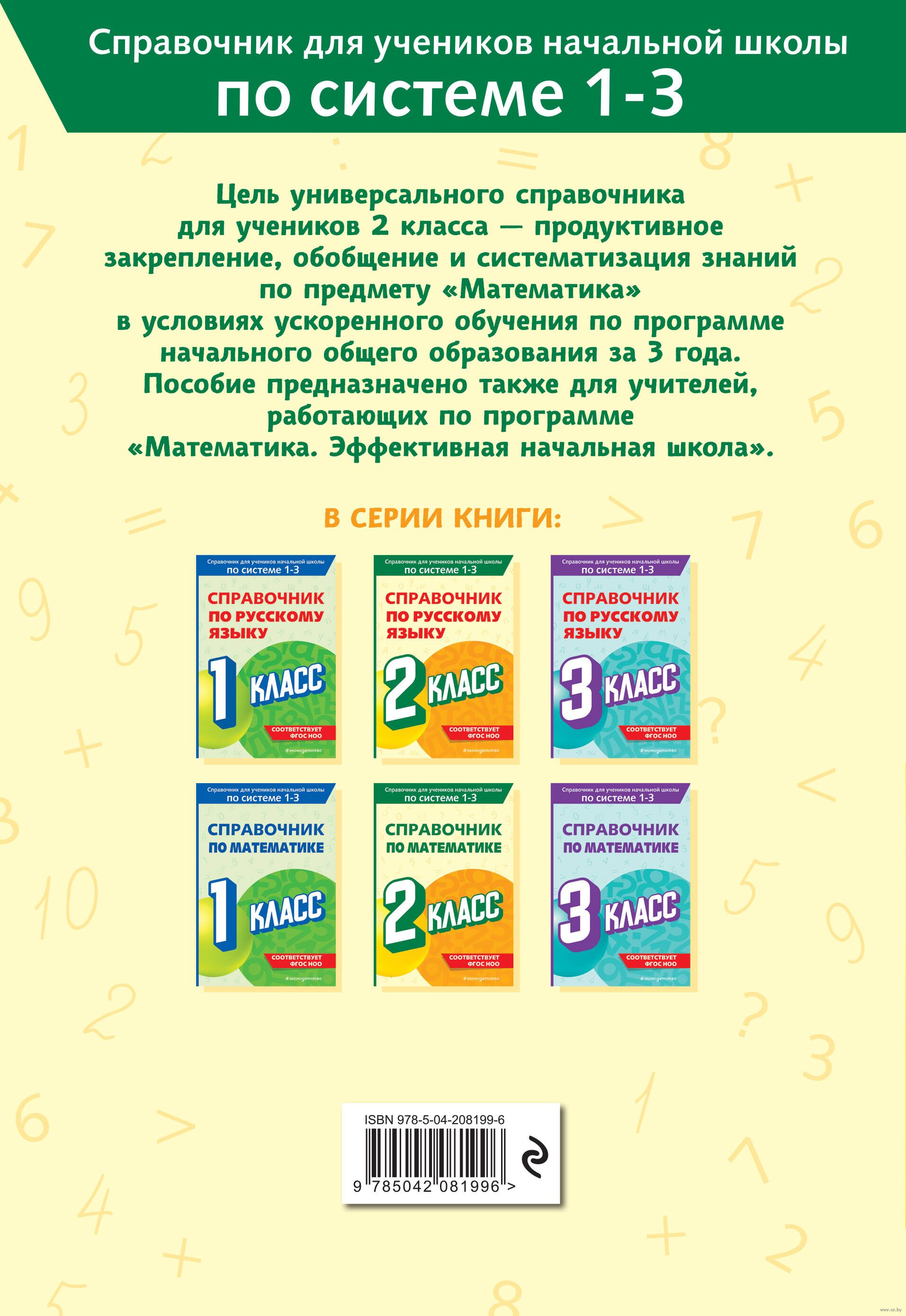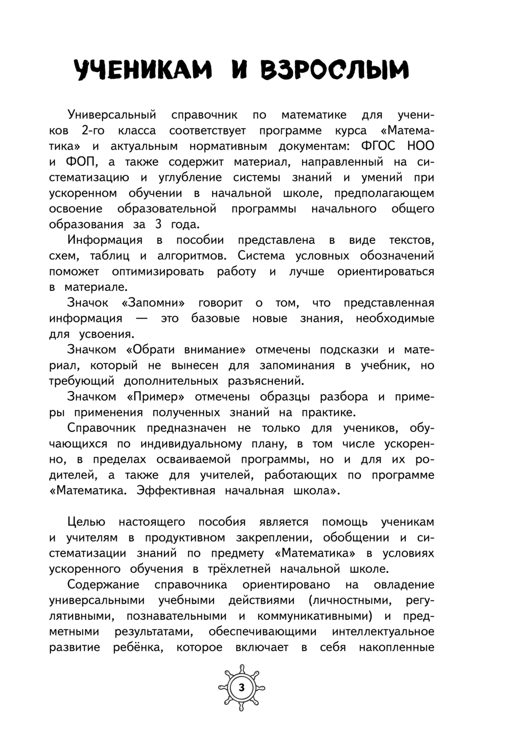 Универсальный справочник по математике для учеников 2 класса содержит весь необходимый материал для систематизации и углубления знаний при ускоренном обучении по программе начального общего образования за 3 года. Вся учебная информация представлена в виде кратких текстов, схем, таблиц и алгоритмов с примерами применения правил. Система условных обозначений поможет лучше ориентироваться в справочнике и облегчит запоминание материала.