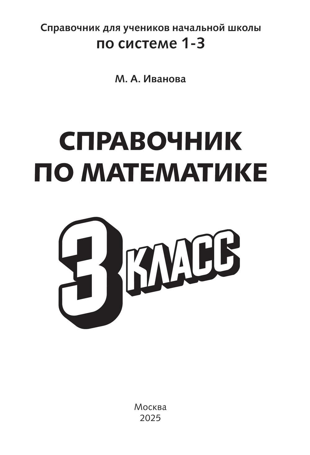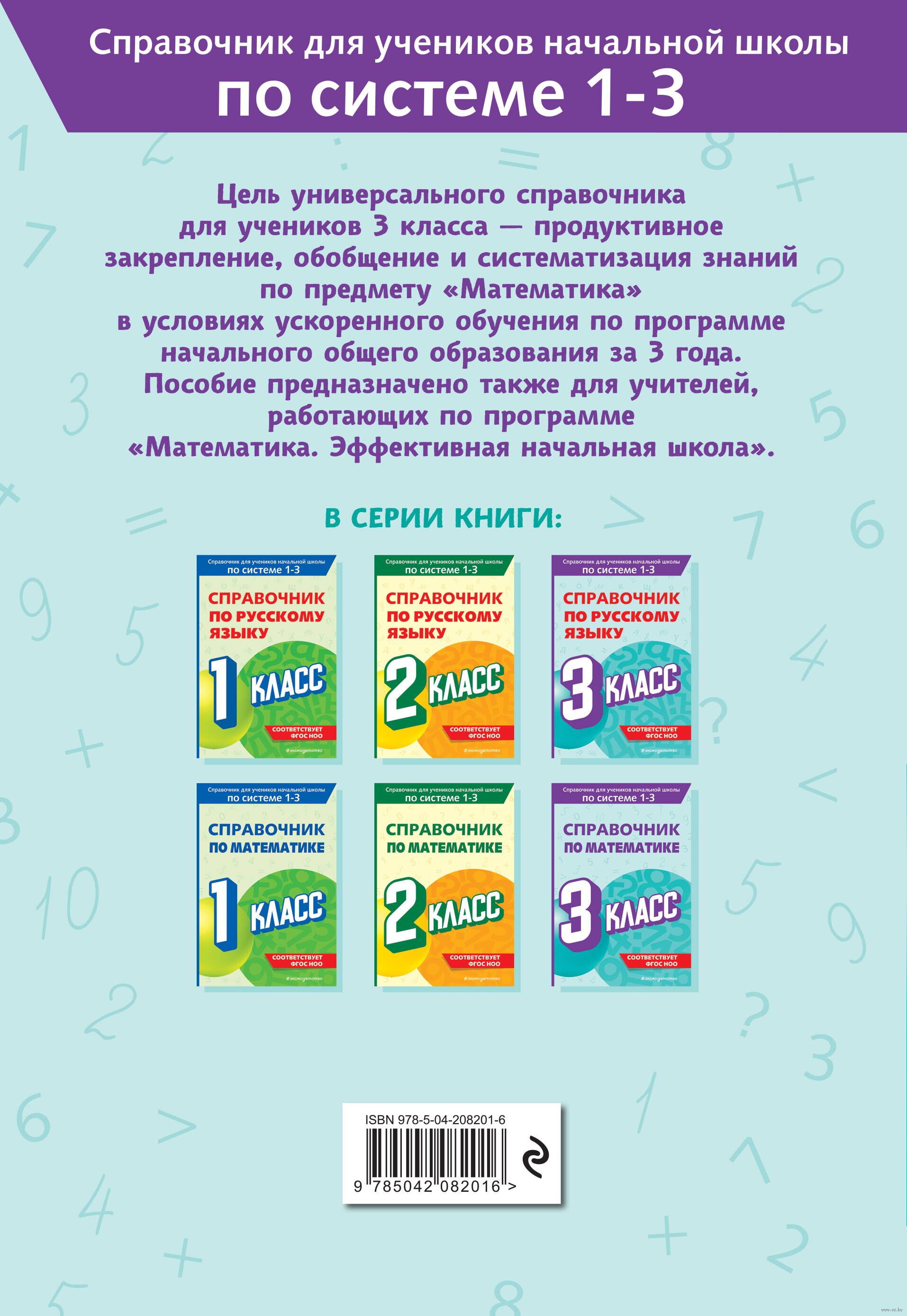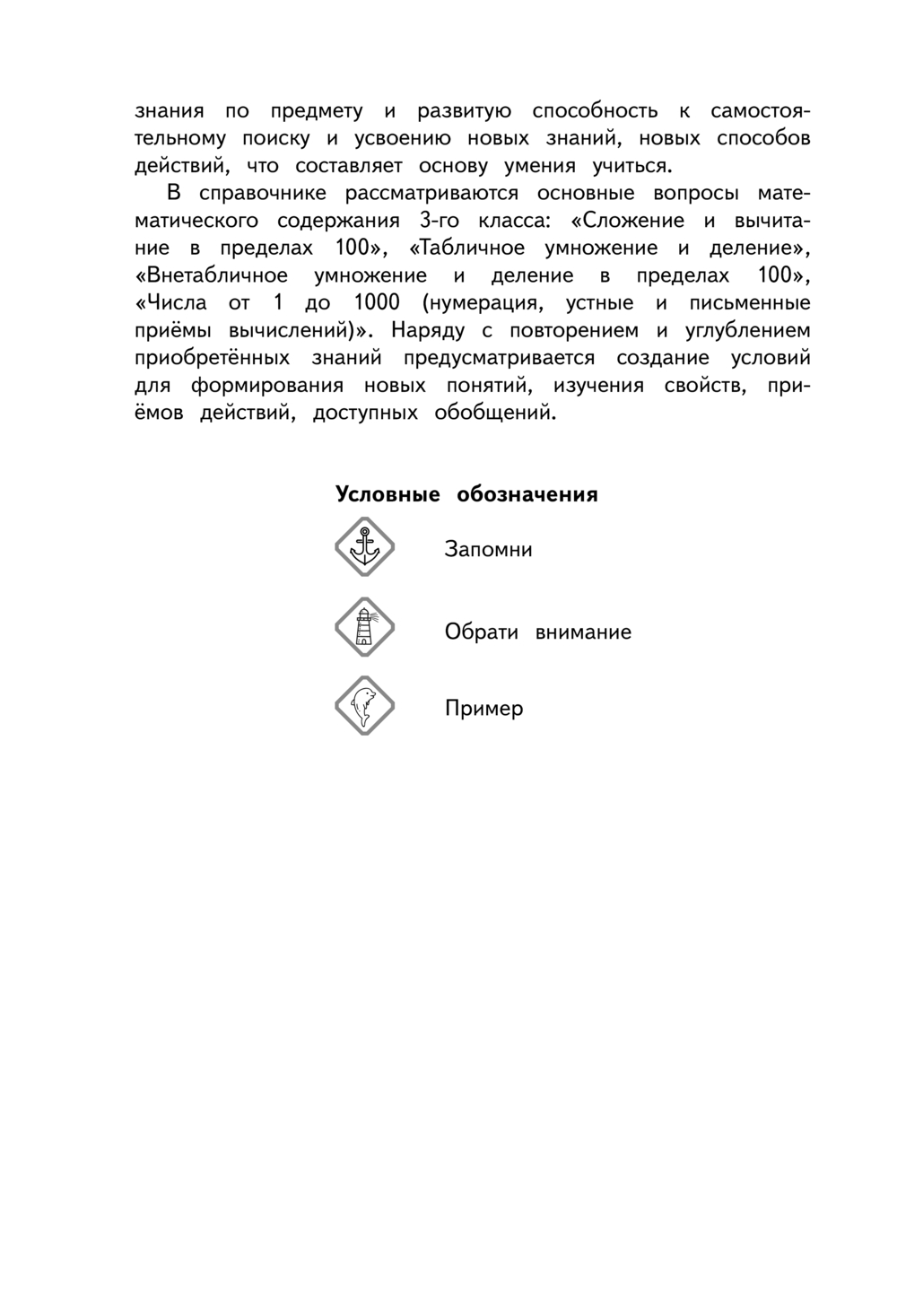 Универсальный справочник по математике для учеников 3 класса содержит весь необходимый материал для систематизации и углубления знаний при ускоренном обучении по программе начального общего образования за 3 года. Вся учебная информация представлена в виде кратких текстов, схем, таблиц и алгоритмов с примерами применения правил. Система условных обозначений поможет лучше ориентироваться в справочнике и облегчит запоминание материала.