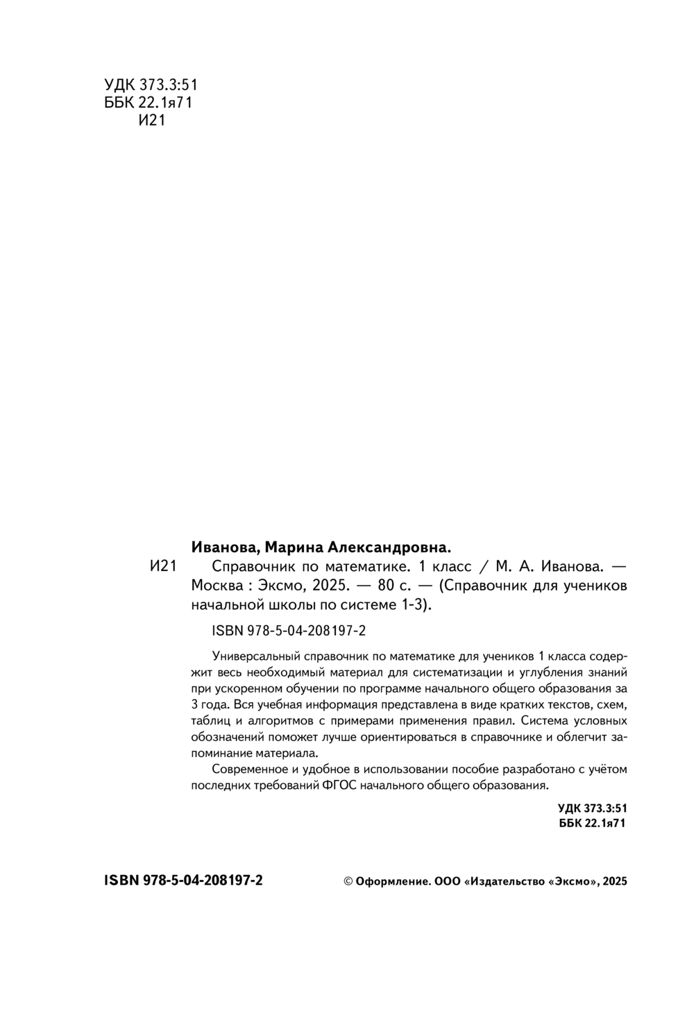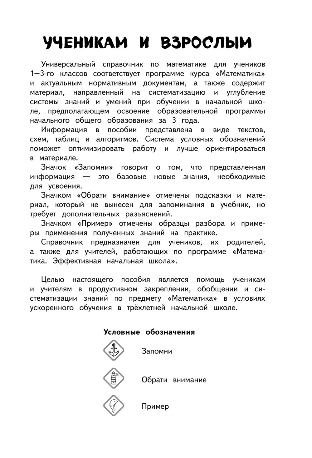 Универсальный справочник по математике для учеников 1 класса содержит весь необходимый материал для систематизации и углубления знаний при ускоренном обучении по программе начального общего образования за 3 года. Вся учебная информация представлена в виде кратких текстов, схем, таблиц и алгоритмов с примерами применения правил. Система условных обозначений поможет лучше ориентироваться в справочнике и облегчит запоминание материала.