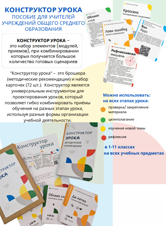 "Конструктор урока" представляет собой набор карточек с описанием креативных методических приемов, интернет-ресурсов и методических рекомендаций. Пособие включает примеры готовых занятий, рекомендации по использованию современных образовательных ресурсов, а также советы по организации обратной связи и оценивания.