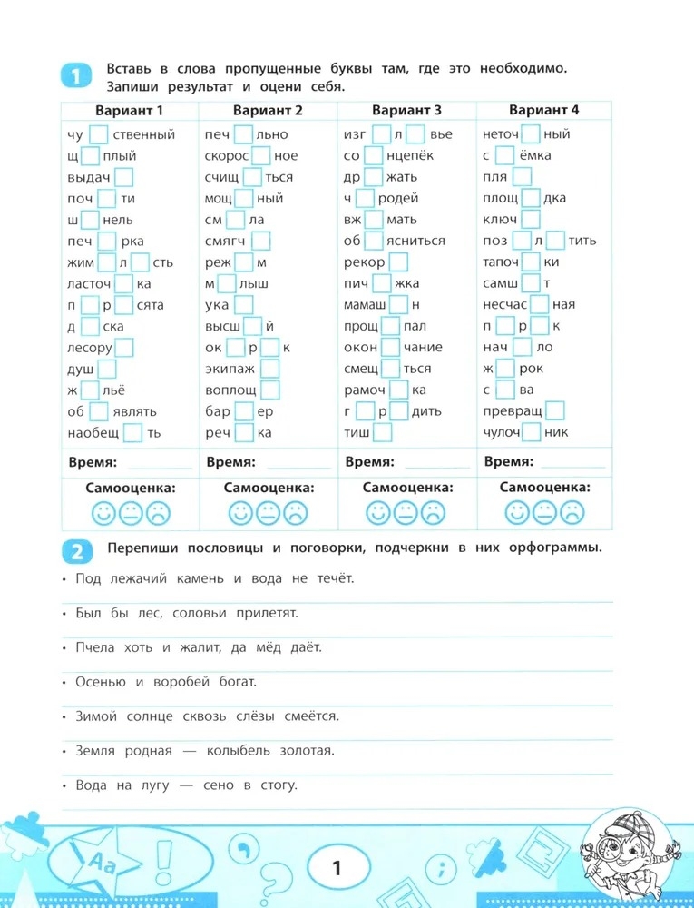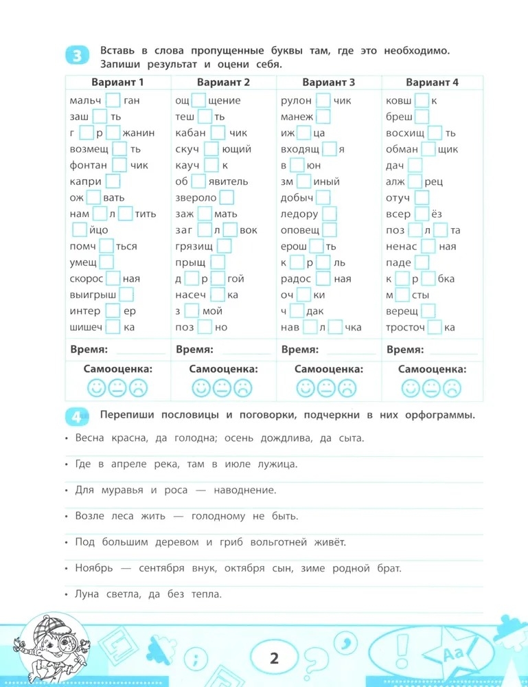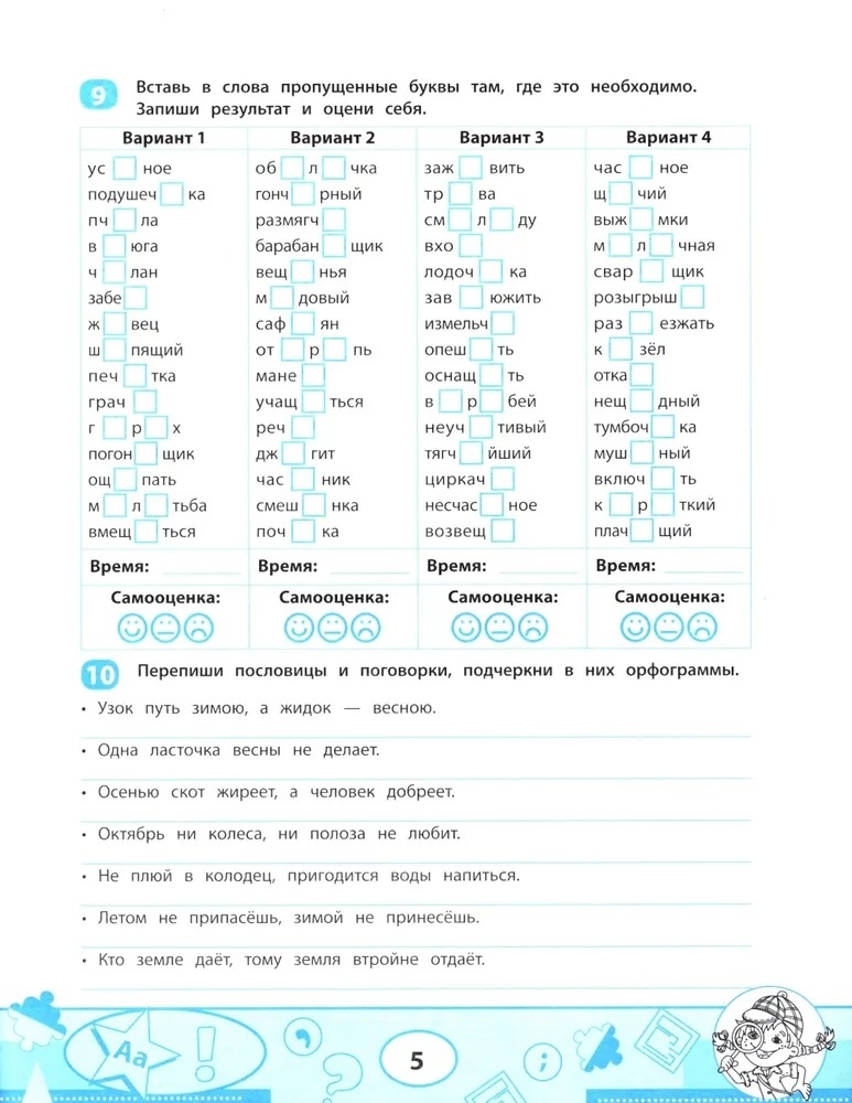 В сборнике представлен комплекс заданий на запоминание и закрепление орфограмм, с которыми дети знакомятся в начальной школе. Смайлики для самооценки и отметки о времени выполнения заданий помогут отслеживать динамику формирования правописных навыков. Задания тренажёра можно использовать как на уроках русского языка, так и на занятиях дома.