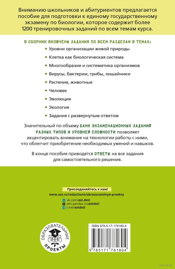 Вниманию школьников и абитуриентов предлагается пособие для подготовки к единому государственному экзамену по биологии, которое содержит более 1200 тренировочных заданий по всем темам курса.