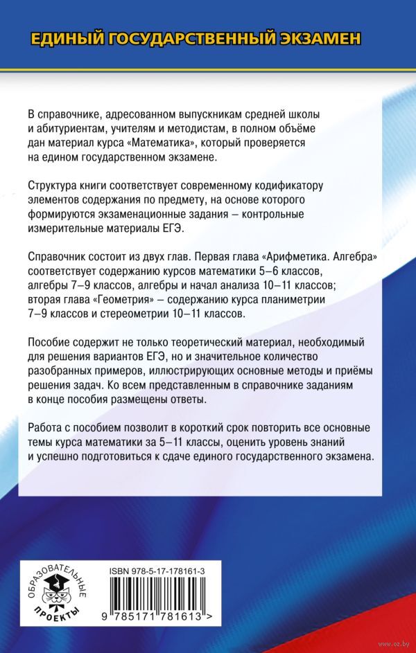 Справочник содержит материал курса "Математика" в объёме, проверяемом на едином государственном экзамене. Структура книги соответствует современному кодификатору элементов содержания по предмету, на основе которого формируются экзаменационные задания – контрольные измерительные материалы ЕГЭ.