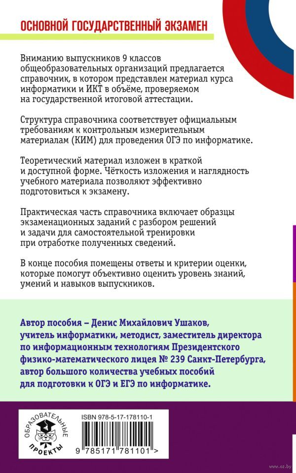 В справочнике представлен материал курса информатики в объёме, проверяемом на государственной итоговой аттестации.Структура справочника соответствует современному кодификатору элементов содержания по предмету, на основе которого составлены контрольные измерительные материалы (КИМы) основного государственного экзамена (ОГЭ).
