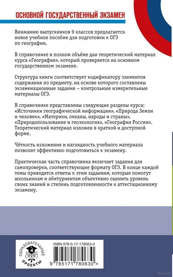 В справочнике, адресованном выпускникам 9 классов общеобразовательных организаций, представлен материал курса географии в объёме, проверяемом на основном государственном экзамене.
