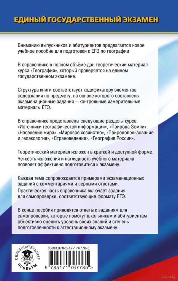 Справочник, адресованный выпускникам средней школы и абитуриентам, содержит весь теоретический материал курса географии, который проверяется на едином государственном экзамене.