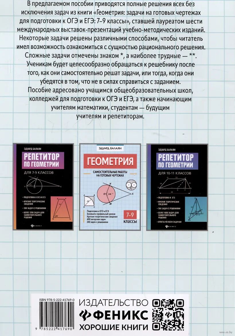 В предлагаемом пособии приводятся полные решения всех без исключения задач из книги Геометрия: задачи на готовых чертежах для подготовки к ОГЭ и ЕГЭ: 7-9 классы, ставшей лауреатом шести международных выставок-презентаций учебно-методических изданий. Некоторые задачи решены различными способами, чтобы читатель имел возможность ознакомиться с сущностью рационального решения. Сложные задачи отмечены знаком *, а наиболее трудные – **. Ученикам будет целесообразно обращаться к решебнику после того, как они самостоятельно решат задачи, или тогда, когда они убедятся в том, что не в силах справиться с заданием. Пособие адресовано учащимся общеобразовательных школ, колледжей для подготовки к ОГЭ и ЕГЭ, а также начинающим учителям математики, студентам – будущим учителям и репетиторам.