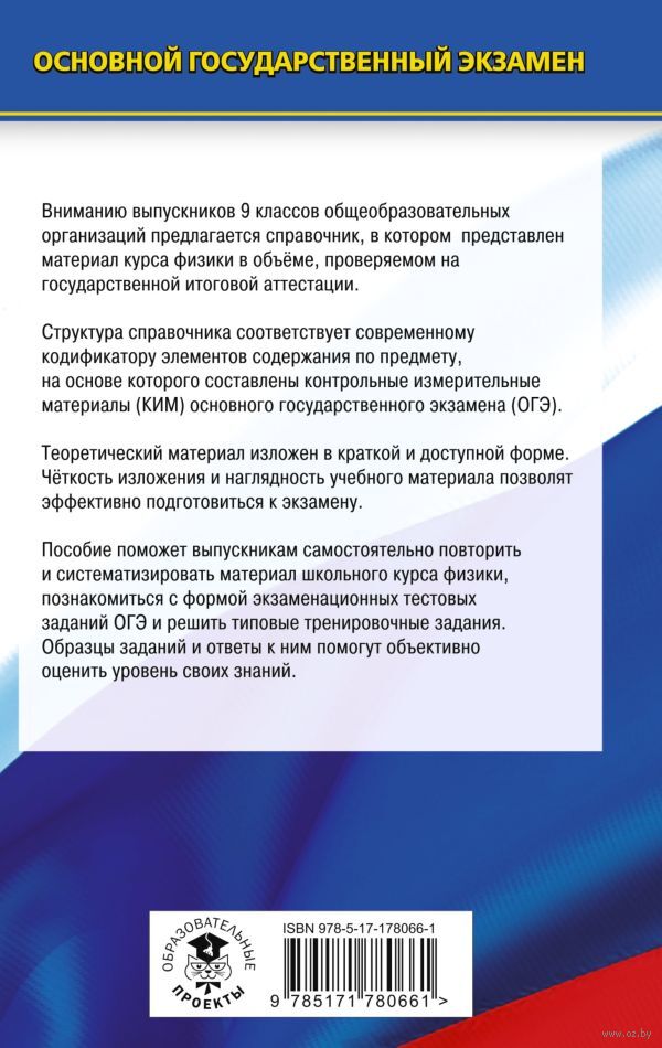 Данный справочник содержит весь теоретический материал по курсу физики, необходимый для сдачи основного государственного экзамена в 9 классе. Он включает в себя все элементы содержания, проверяемые контрольными и измерительными материалами, и помогает обобщить и систематизировать знания и умения за курс основной школы.