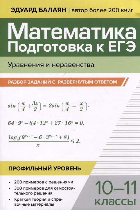 В предлагаемом пособии представлен материал профильного уровня для подготовки к ЕГЭ: решение уравнений и неравенств. В него входят все основные методы решения уравнений, изучаемых в основной и старшей школе: целых рациональных, дробно-рациональных, иррациональных, логарифмических и показательных.