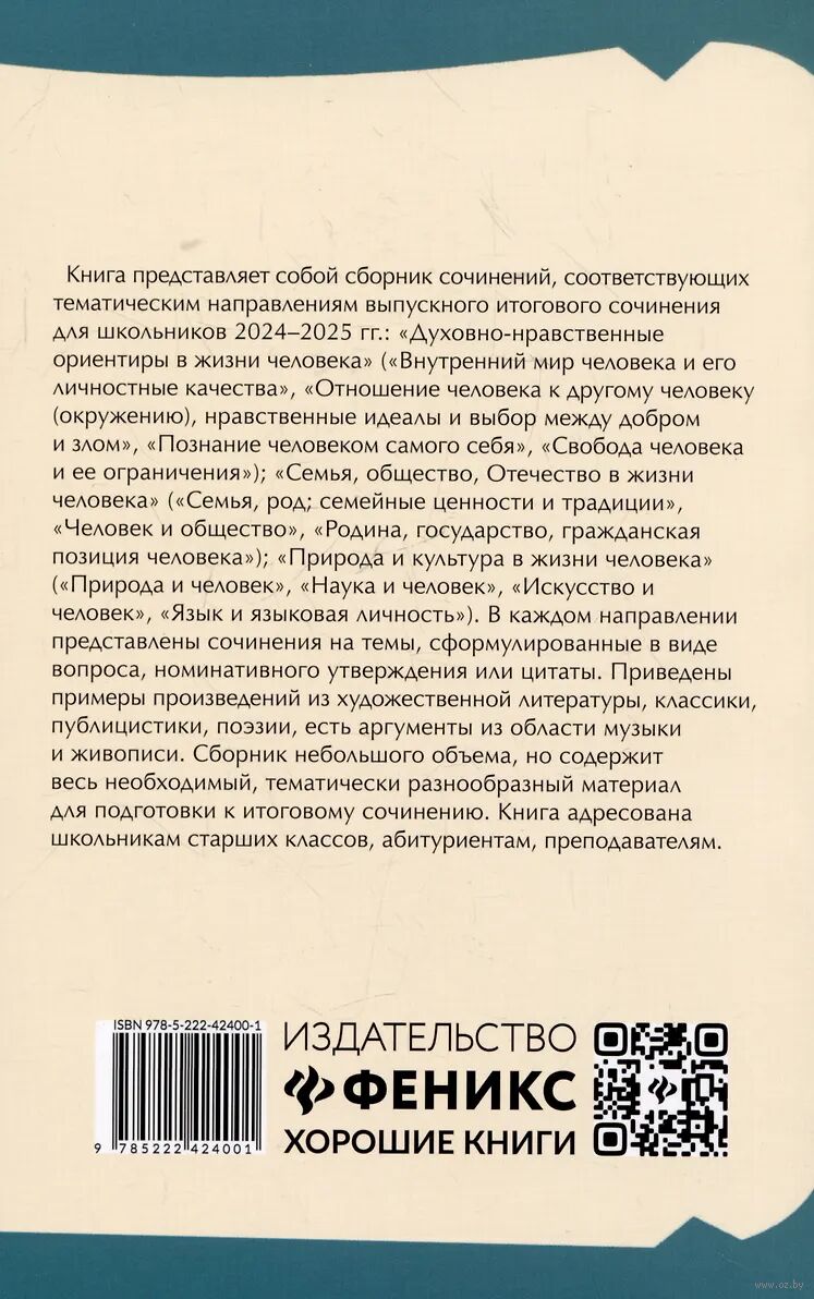 Книга представляет собой сборник сочинений, соответствующих тематическим направлениям выпускного итогового сочинения для школьников 2024-2025 гг.: "Духовно-нравственные ориентиры в жизни человека" ("Внутренний мир человека и его личностные качества", "Отношение человека к другому человеку (окружению), нравственные идеалы и выбор между добром и злом", "Познание человеком самого себя", "Свобода человека и ее ограничения"); "Семья, общество, Отечество в жизни человека" ("Семья, род; семейные ценности и традиции", "Человек и общество", "Родина, государство, гражданская позиция человека"); "Природа и культура в жизни человека" ("Природа и человек", "Наука и человек", "Искусство и человек", "Язык и языковая личность"). В каждом направлении представлены сочинения на темы, сформулированные в виде вопроса, номинативного утверждения или цитаты. Приведены примеры произведений из художественной литературы, классики, публицистики, поэзии, есть аргументы из> области музыки и живописи. Сборник небольшого объема, но содержит весь необходимый, тематически разнообразный материал для подготовки к итоговому сочинению.