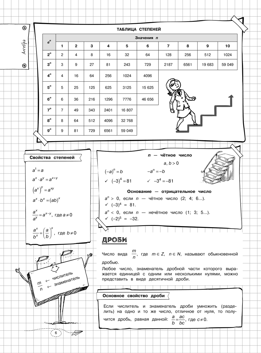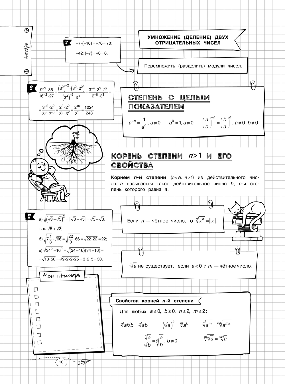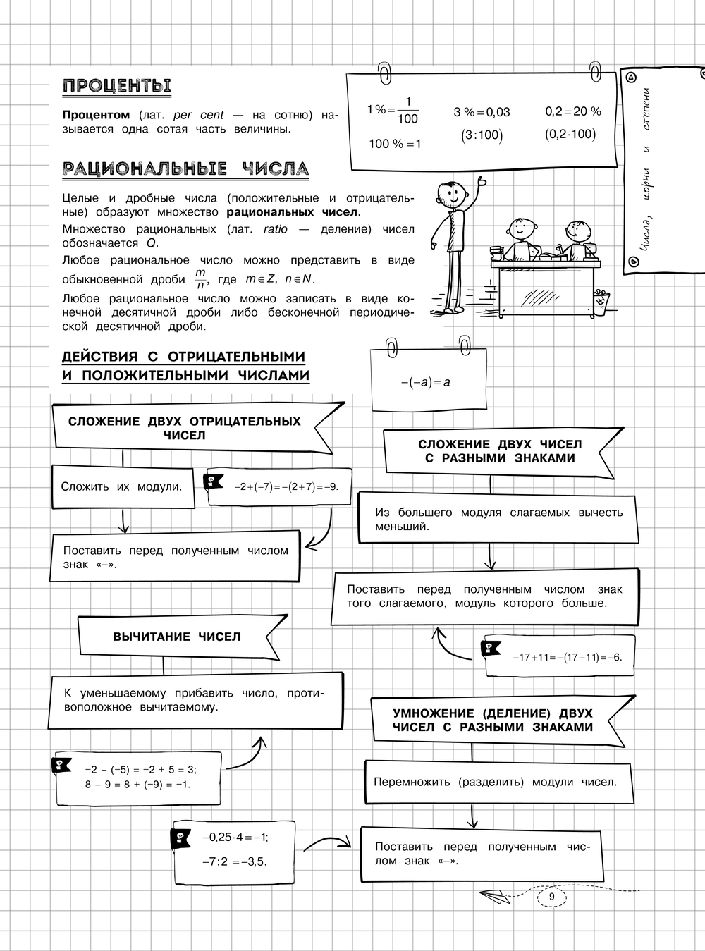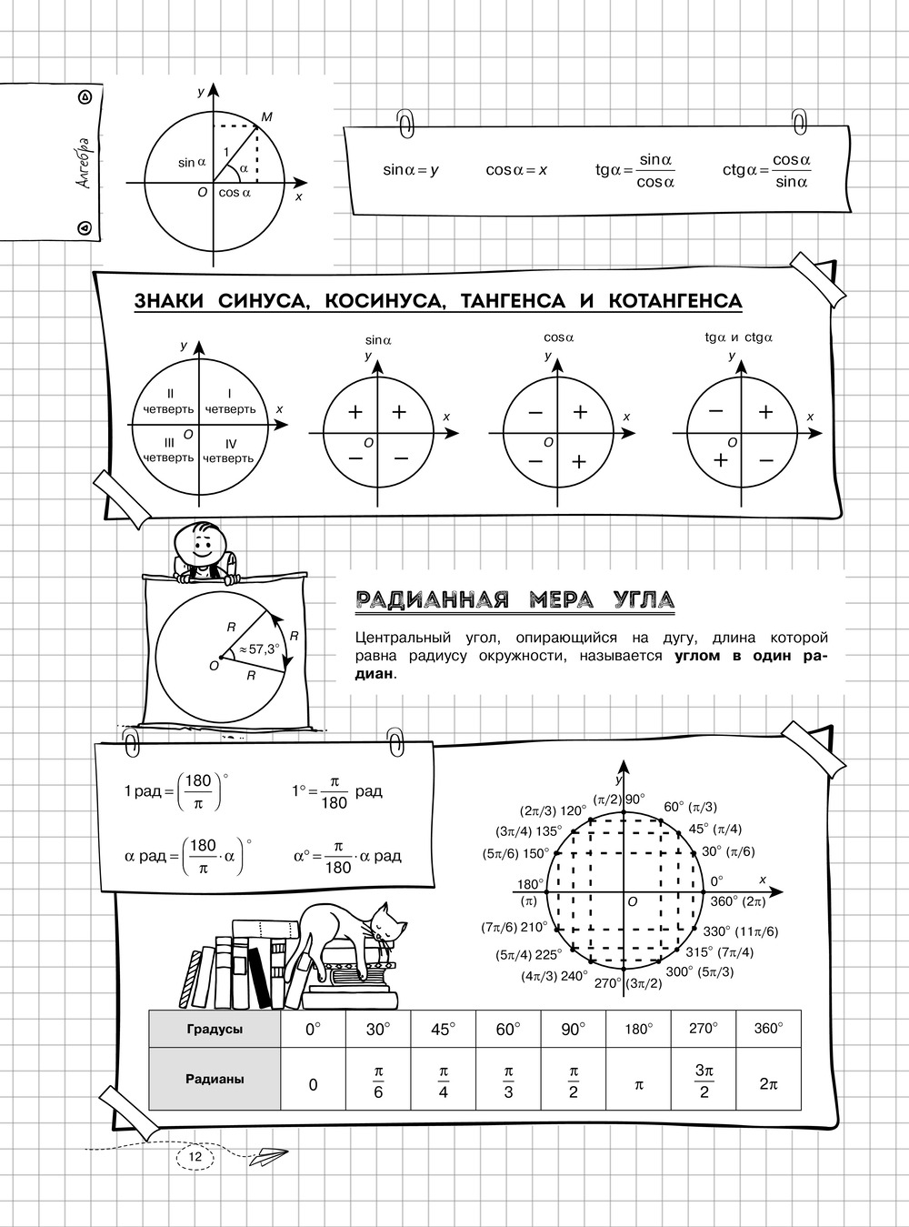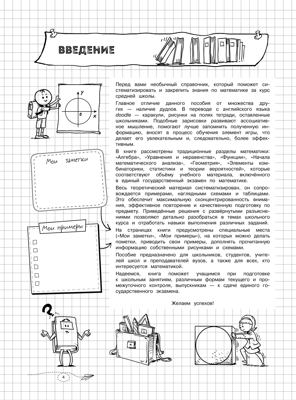 Справочник содержит сведения по всем темам школьного курса математики за 5–11 классы. Теоретический материал представлен в форме удобных конспектов, сопровождается примерами, наглядными схемами и таблицами, а также забавными рисунками, которые помогут легче разобраться в информации и лучше запомнить ее.