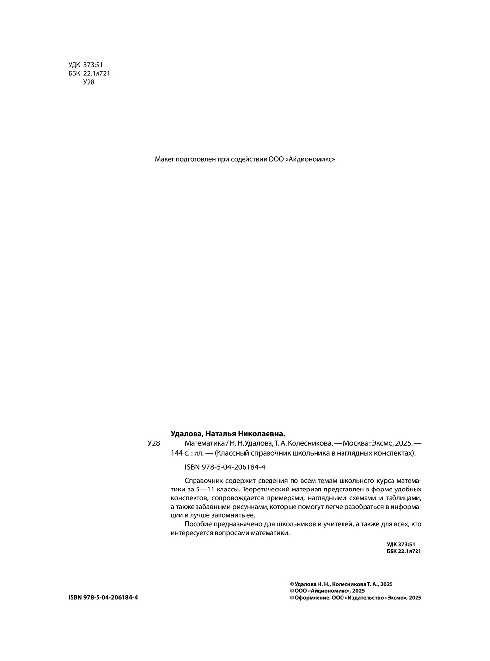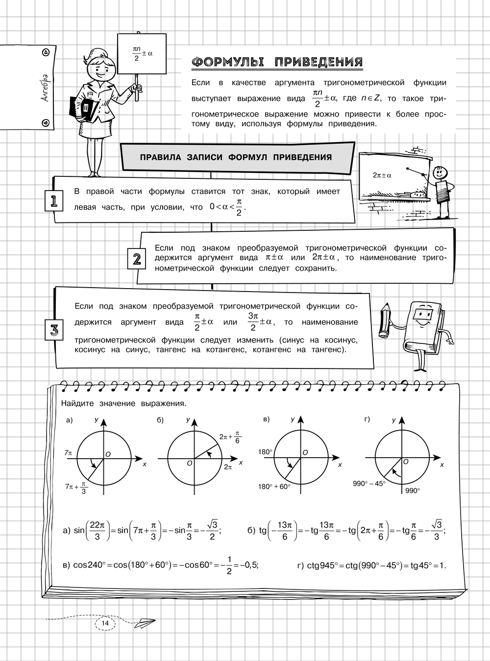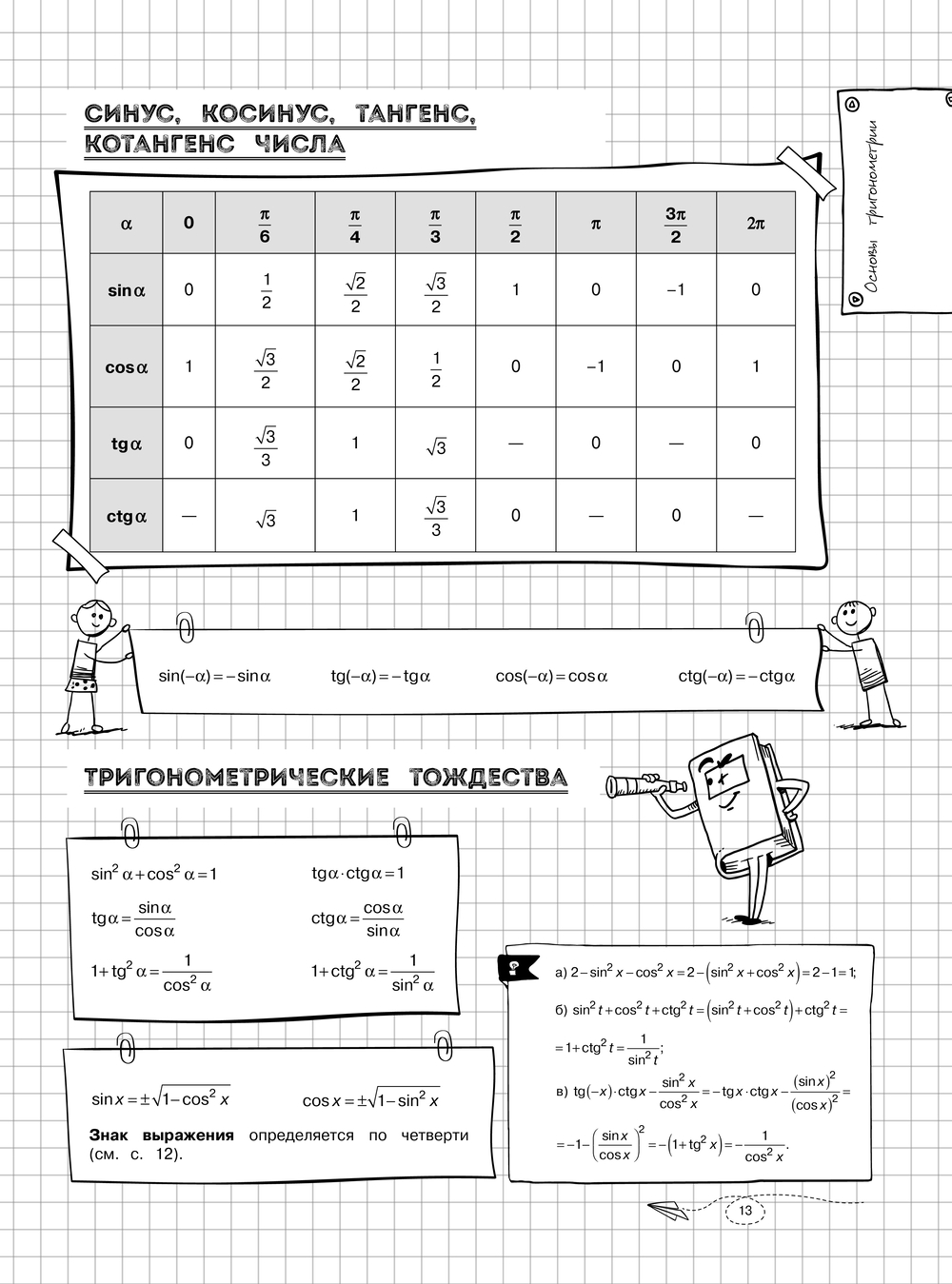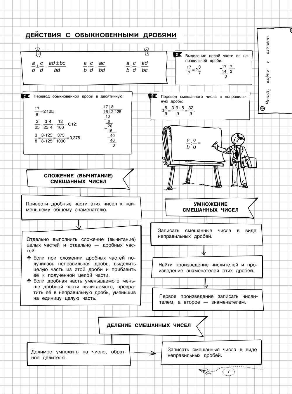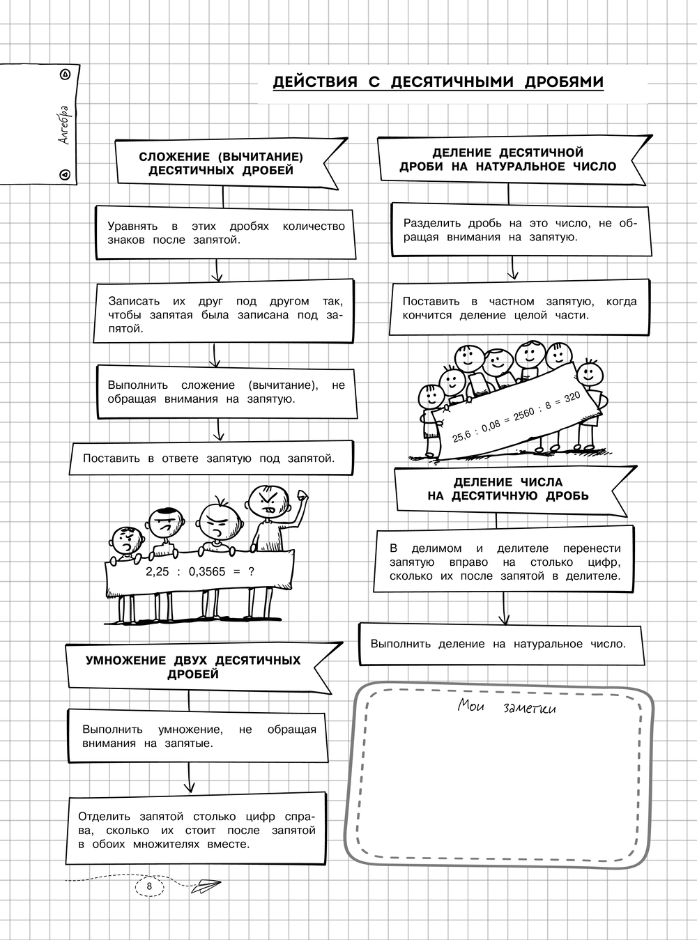 Справочник содержит сведения по всем темам школьного курса математики за 5–11 классы. Теоретический материал представлен в форме удобных конспектов, сопровождается примерами, наглядными схемами и таблицами, а также забавными рисунками, которые помогут легче разобраться в информации и лучше запомнить ее.