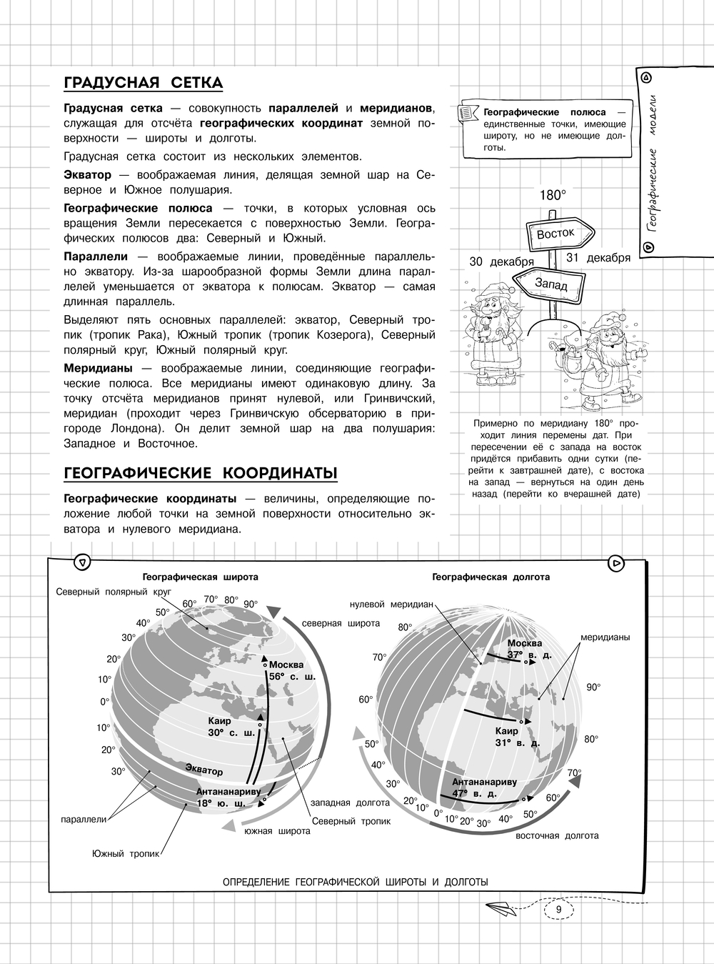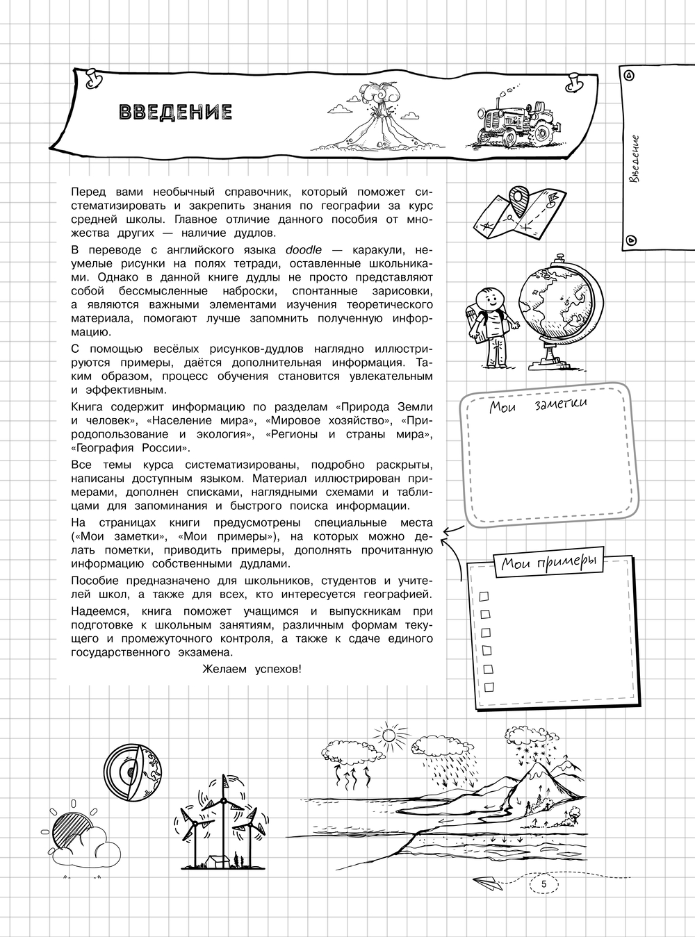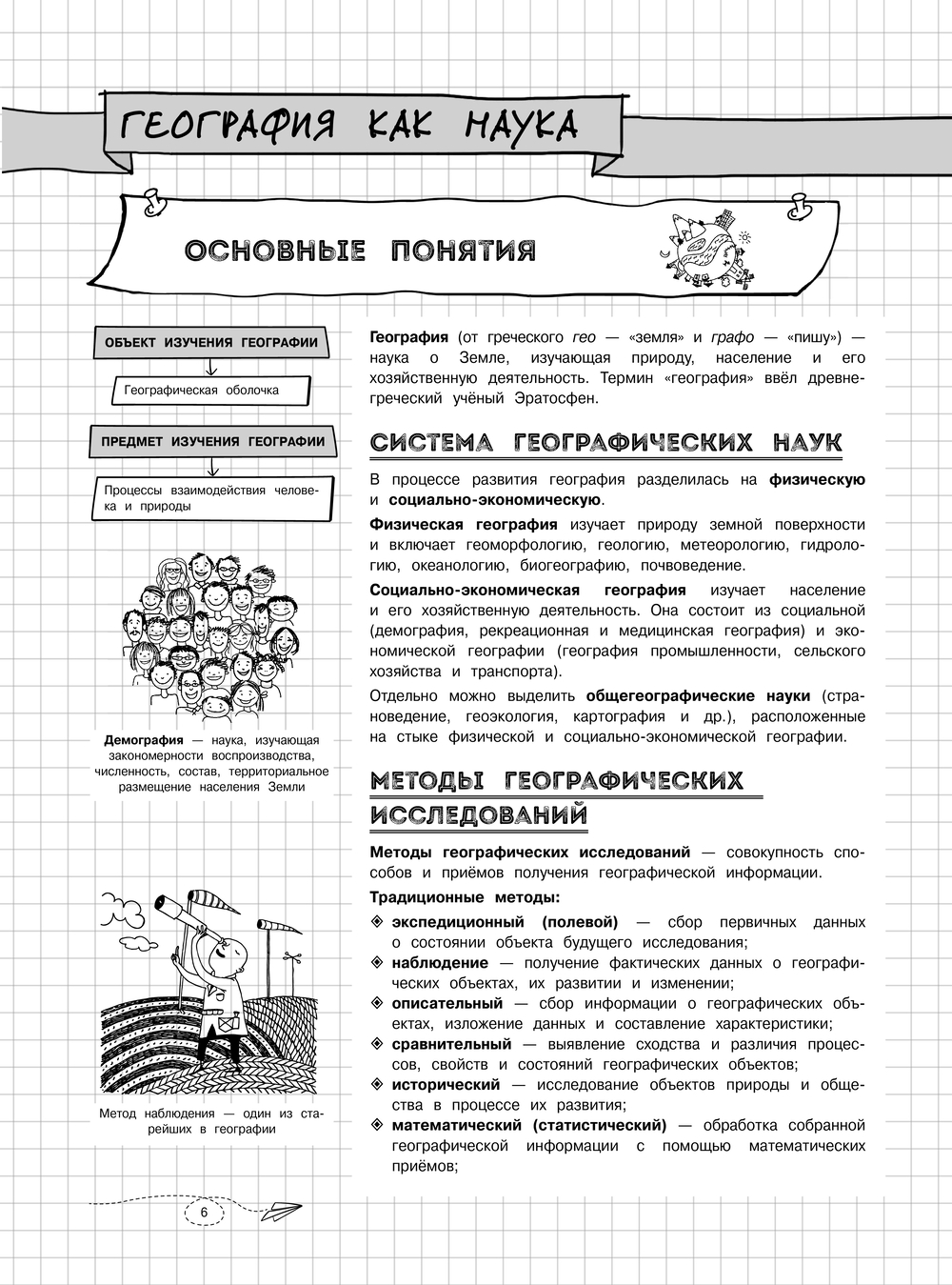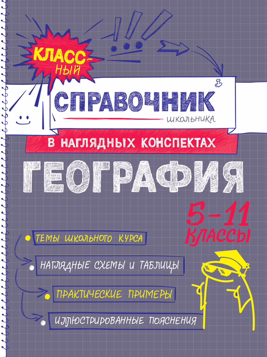 Справочник содержит сведения по всем темам школьного курса географии за 5–11 классы. Теоретический материал представлен в форме удобных конспектов, сопровождается примерами, наглядными схемами и таблицами, а также забавными рисунками, которые помогут легче разобраться в информации и лучше запомнить ее.