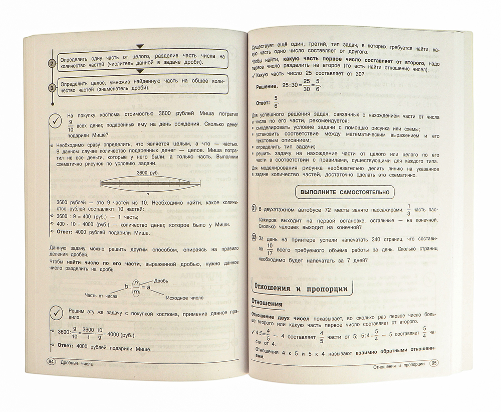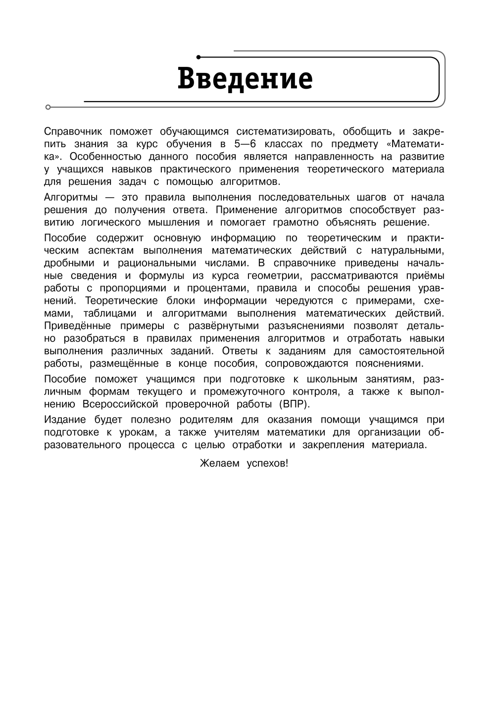 В пособии представлены алгоритмы решения типовых задач и примеров по математике, изучаемых в 5-6 классах. Перед каждым алгоритмом помещён краткий теоретический блок по теме с необходимыми правилами и формулами. После алгоритма приведён пример решения задачи, даны задания для самостоятельного выполнения.