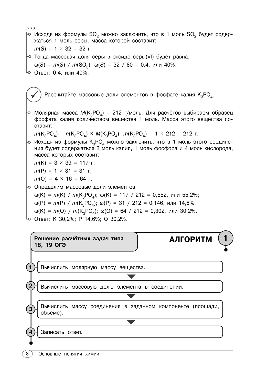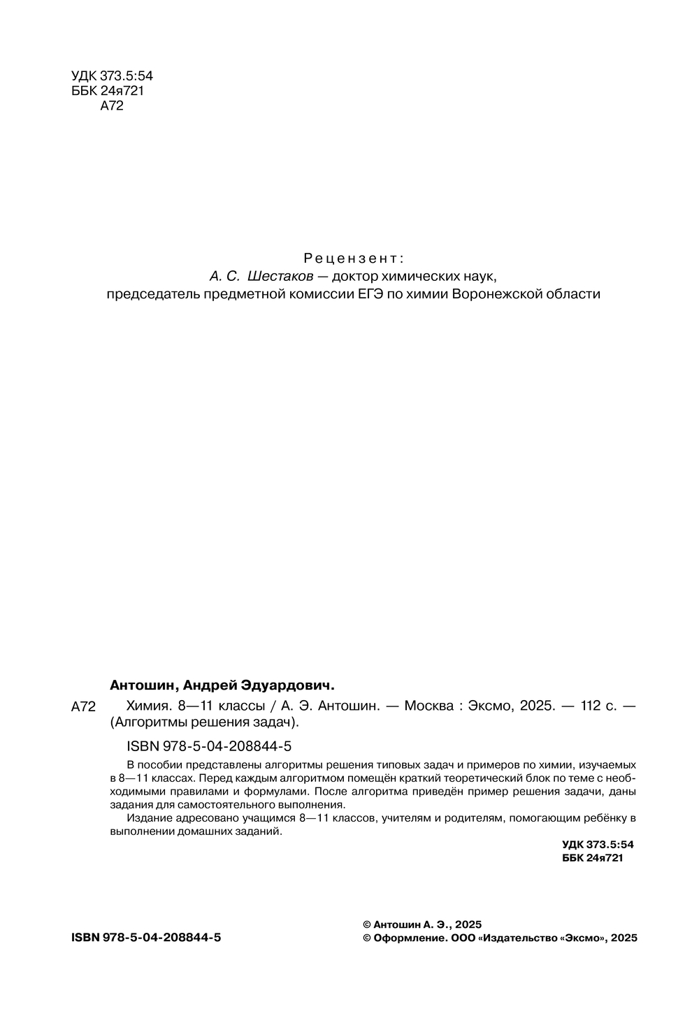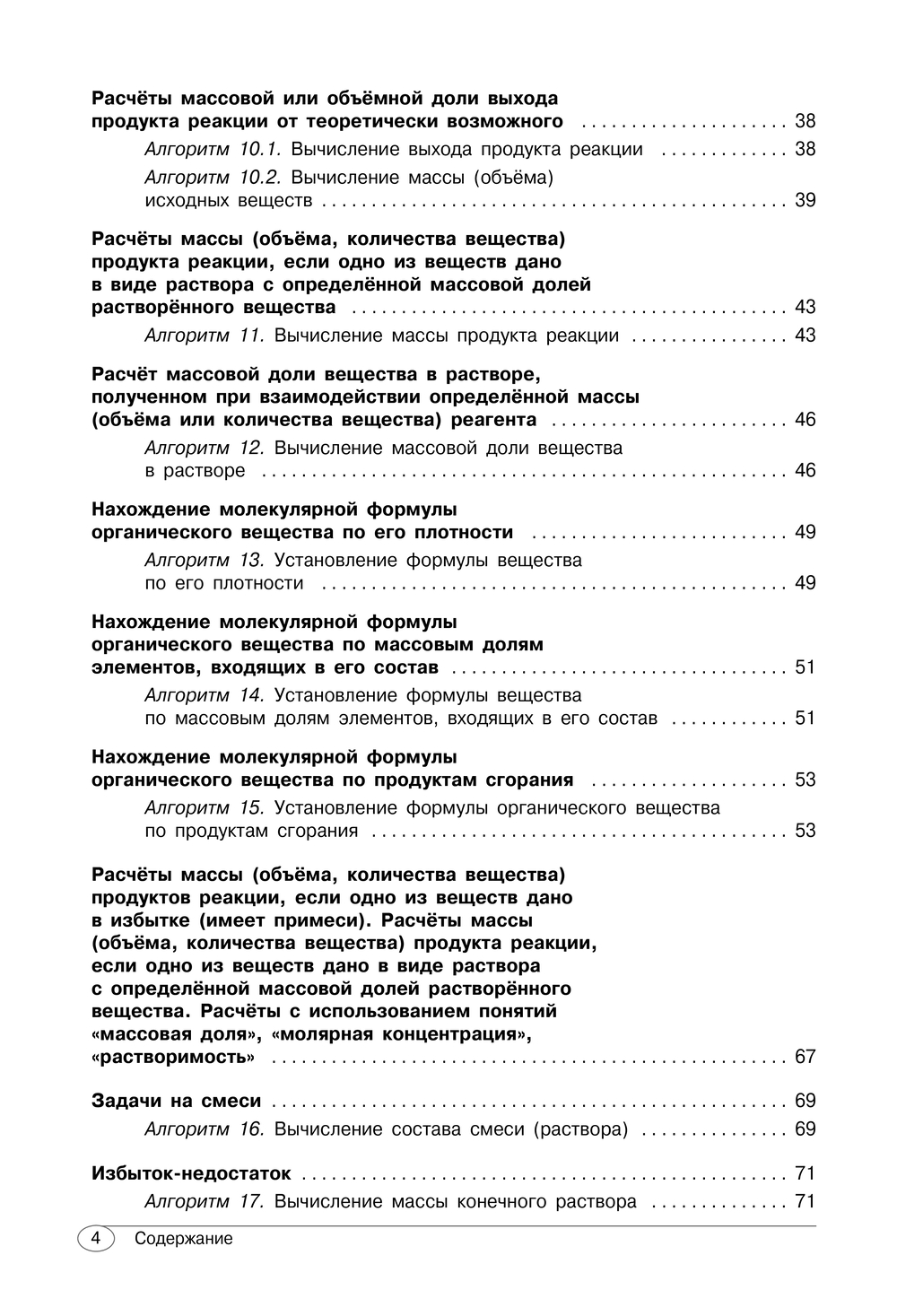 В пособии представлены алгоритмы решения типовых задач и примеров по химии, изучаемых в 8-11 классах. Перед каждым алгоритмом помещён краткий теоретический блок по теме с необходимыми правилами и формулами. После алгоритма приведён пример решения задачи, даны задания для самостоятельного выполнения.