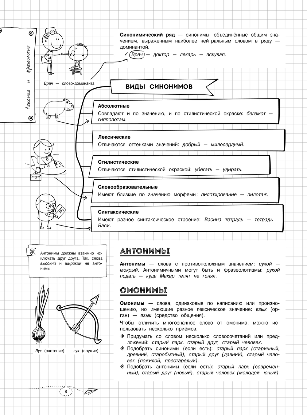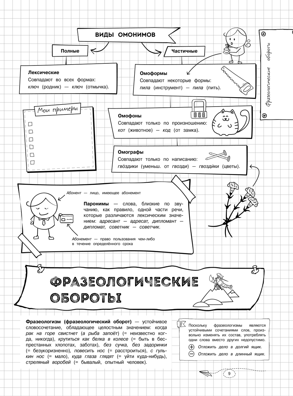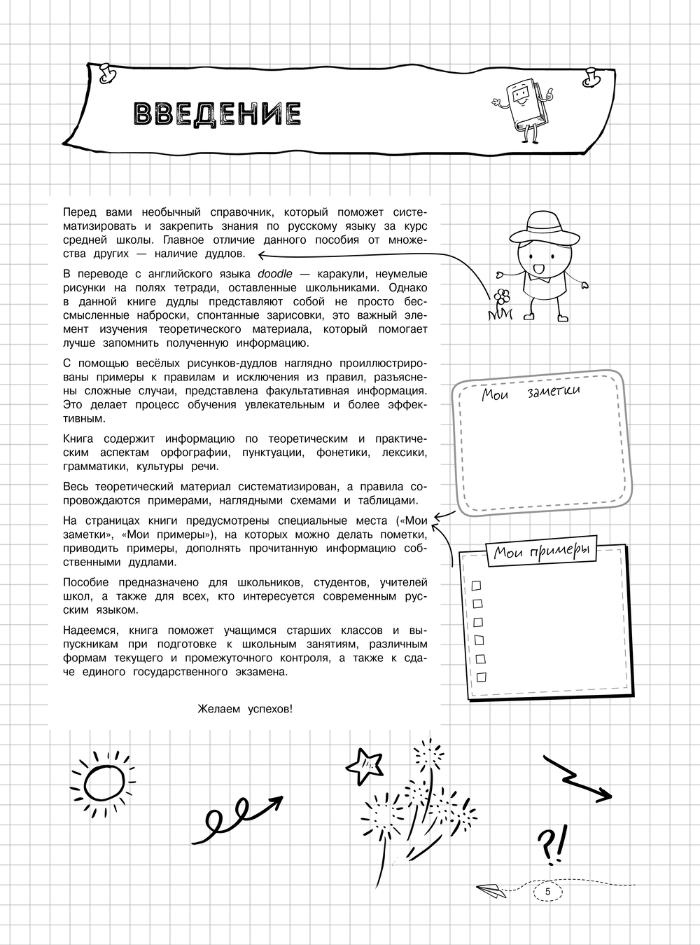 Справочник содержит сведения по всем темам школьного курса русского языка за 5–11 классы. Теоретический материал представлен в форме удобных конспектов, сопровождается примерами, наглядными схемами и таблицами, а также забавными рисунками, которые помогут легче разобраться в информации и лучше запомнить ее.