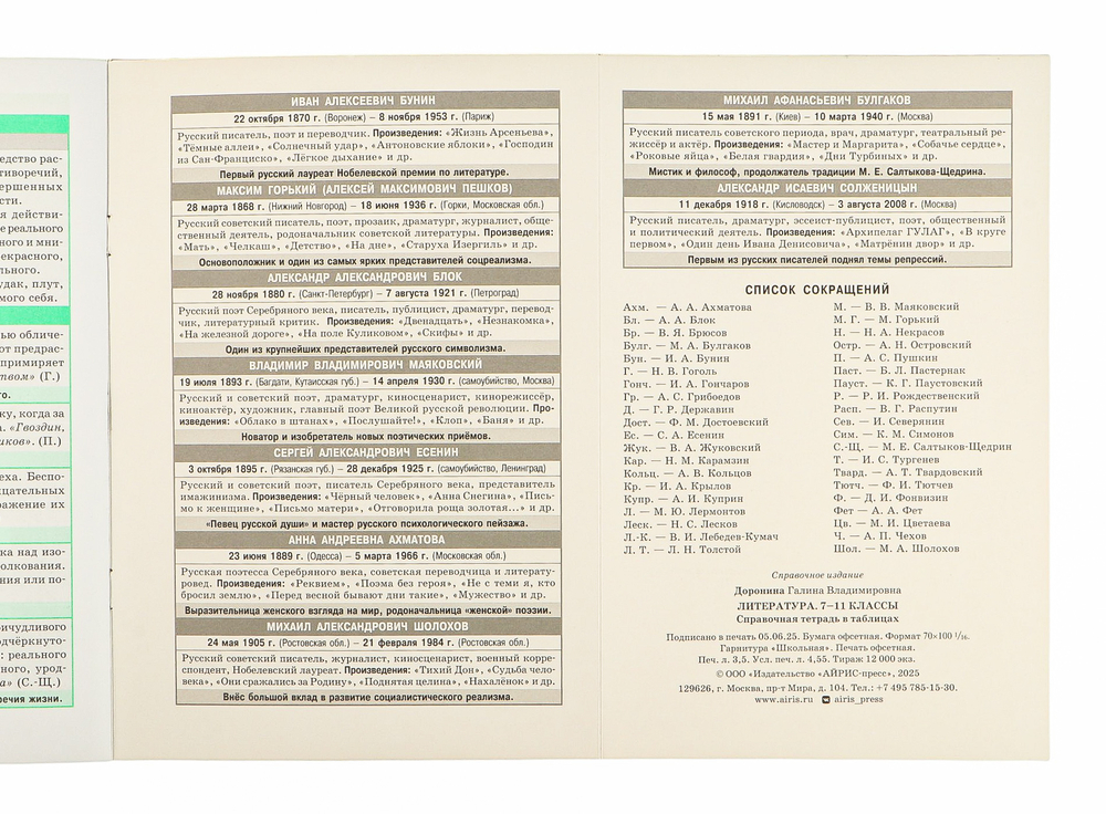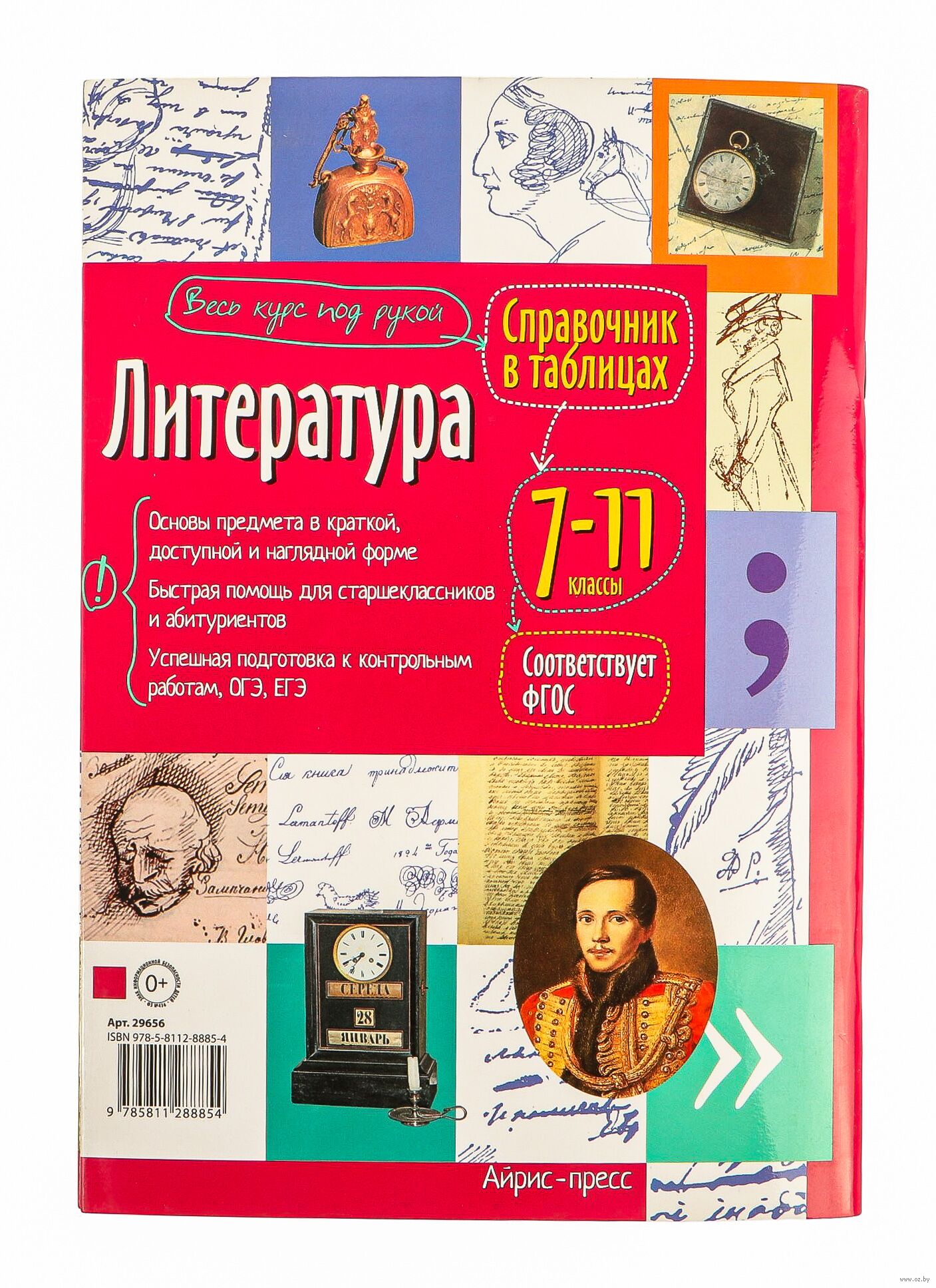 Справочник содержит весь теоретический курс литературы для средней школы. Материал в нем сформулирован кратко и представлен в виде таблиц, каждая тема дается на отдельной странице. Благодаря такой наглядной подаче усвоить любую тему будет легко при любом уровне подготовленности. Быстро ориентироваться в пособии поможет удобная поисковая система. Клапаны книги могут быть использованы для записи необходимых заметок во время занятий и как закладки. Такой справочник должен быть всегда под рукой у старшеклассников и абитуриентов для успешной подготовки к проверочным работам и экзаменам.