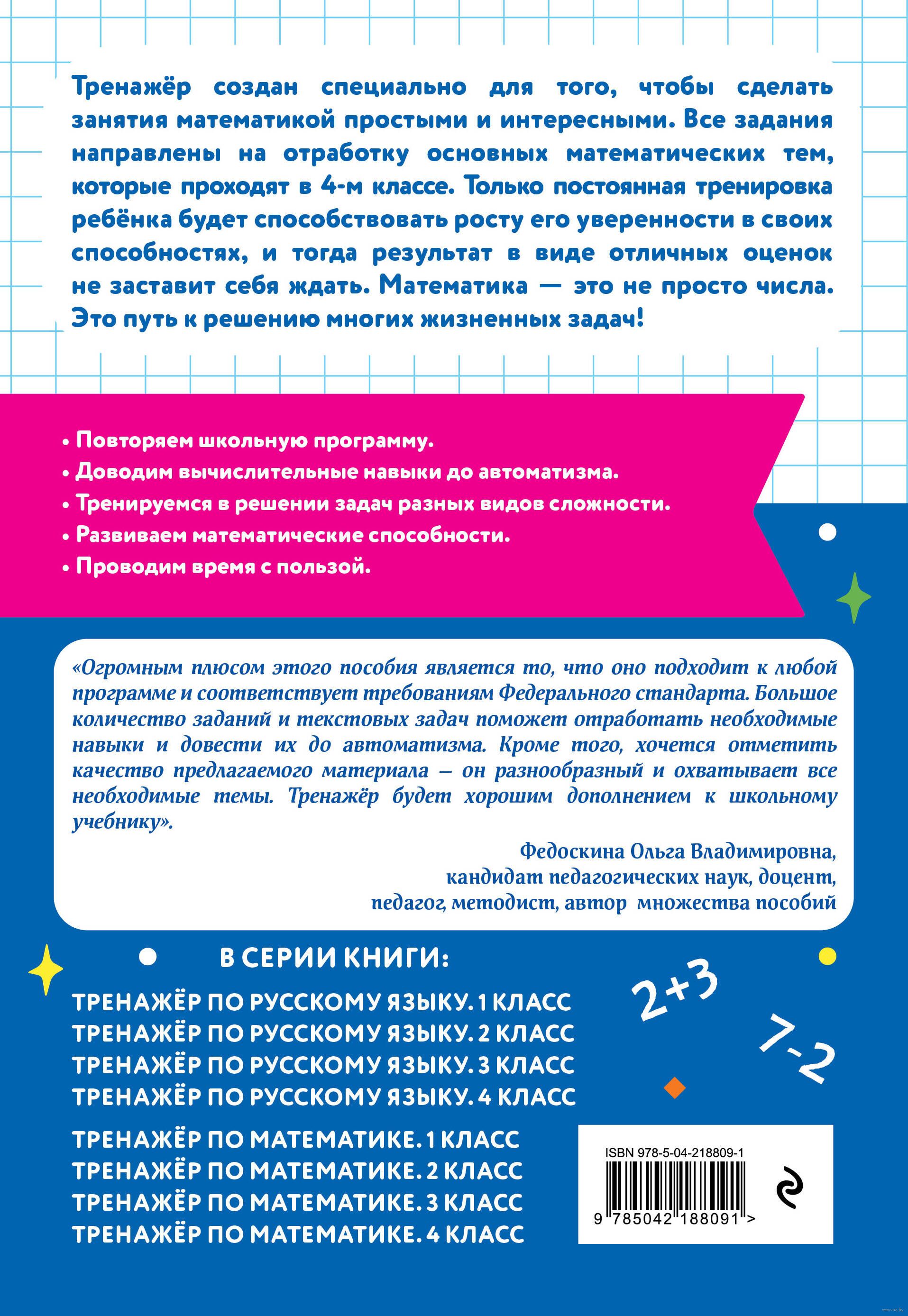 Пособие, соответствующее ФГОС, станет отличным помощником для учеников 4-го класса в отработке умений, полученных на уроках математики. Занимаясь 15-20 минут в день, учащиеся смогут закрепить навыки решения примеров в пределах 1 000 000, уравнений, повторят величины и разные типы задач, научатся понимать и принимать учебную задачу, анализировать информацию.