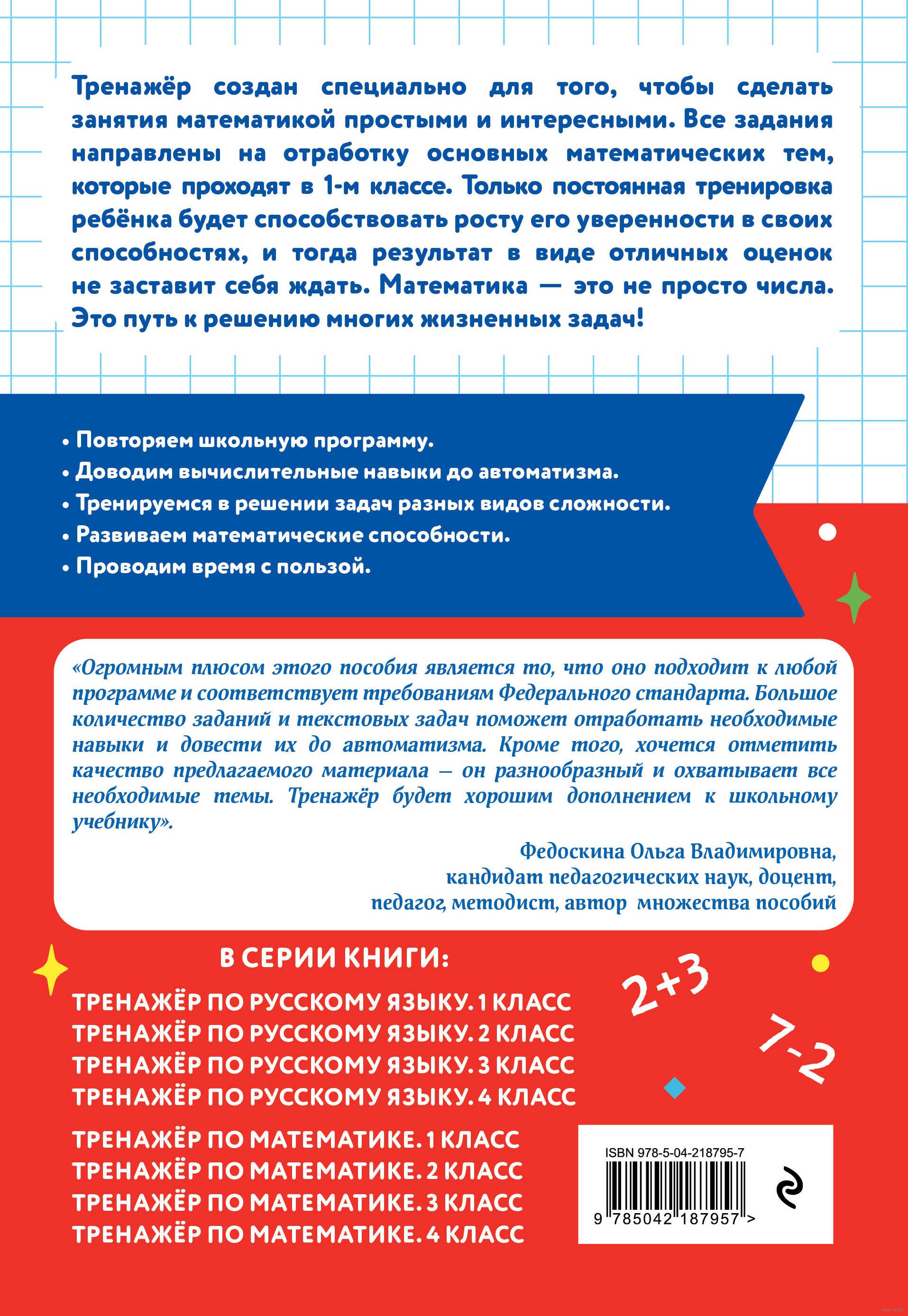 Пособие подготовлено в соответствии с требованиями ФГОС для начальной школы и может быть использовано с любым из действующих учебников по математике для 1-го класса. Занимаясь 15-20 минут в день, учащиеся смогут закрепить навыки решения примеров на сложение и вычитание в пределах 20 и задач в одно и два действия, научатся понимать и принимать учебную задачу, анализировать информацию.