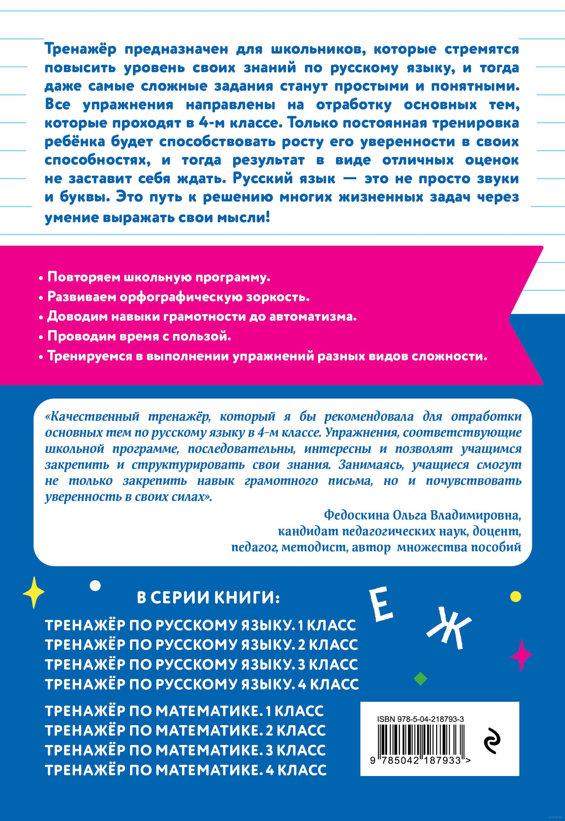 Тренажёр по русскому языку, соответствующий ФГОС для начальной школы, поможет развить у школьников навыки грамотного письма. Занимаясь, ребёнок потренируется определять время и вид глаголов, правильно писать безударные окончания глаголов, сочетания "тся" и "ться", частицу "не" с глаголами, буквы "о", "е" после шипящих и "ц", находить однородные члены, различать простые и сложные предложения.
