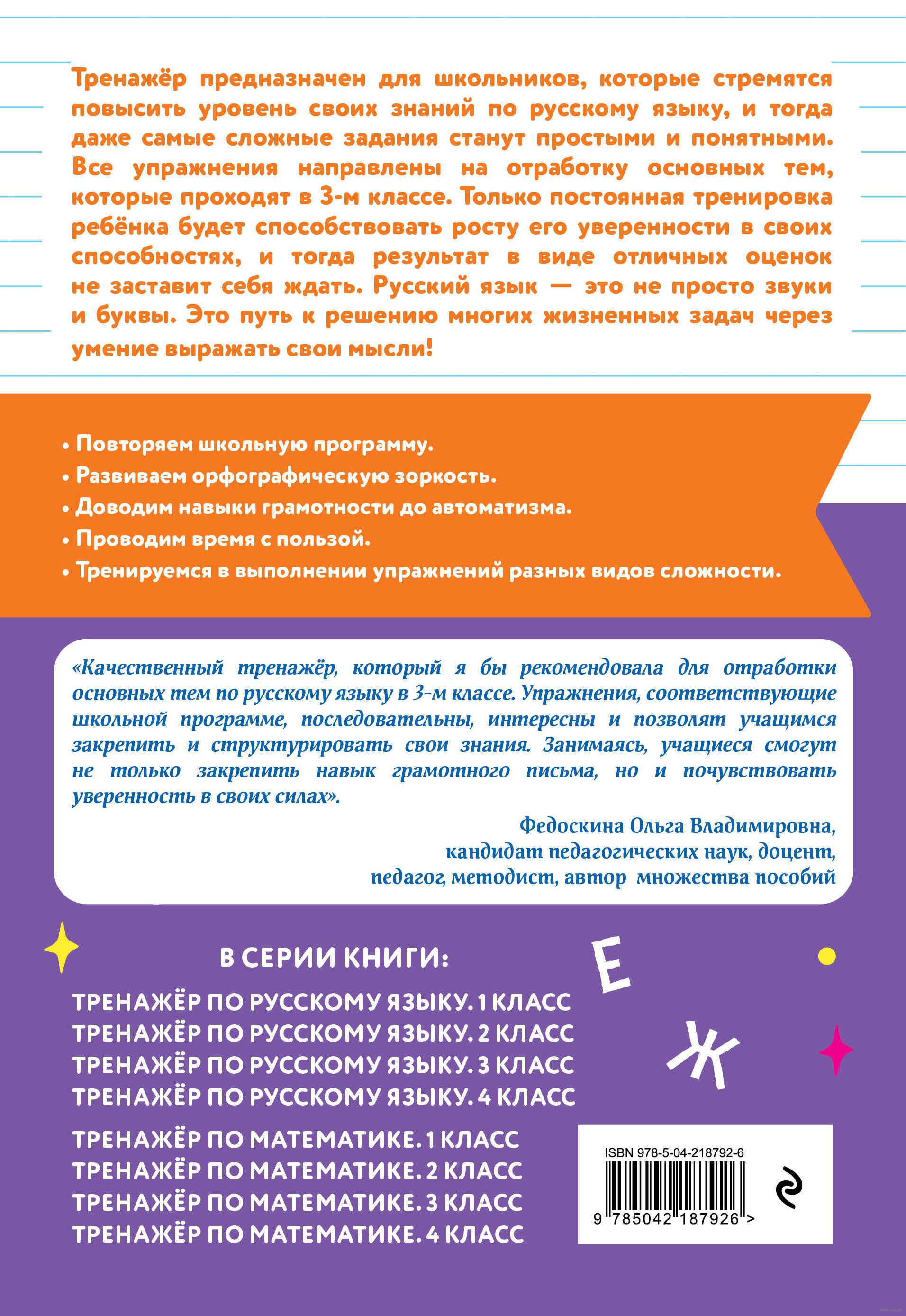 Тренажёр по русскому языку, соответствующий ФГОС для начальной школы, поможет развить у школьников навыки грамотного письма. Занимаясь, ребёнок потренируется в написании безударной гласной в корне, приставок и предлогов, безударной гласной в падежных окончаниях, научится различать простые и сложные предложения.