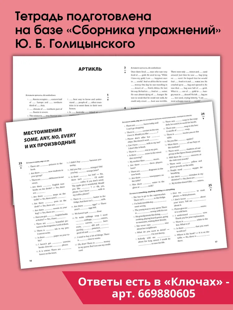Сборник упражнений по грамматике английского языка Ю. Б. Голицынского широко используется в учебном процессе общеобразовательных учреждений России и стран СНГ. Система упражнений Ю. Б. Голицынского на протяжении многих лет доказала эффективность в решении учебных задач. Предлагаемая рабочая тетрадь для 10–11 классов (в двух частях) создана на основе материалов сборника. Первая часть содержит задания и упражнения для самостоятельной работы учащихся, способствующие усвоению, активизации и систематизации лексико-грамматического материала по следующим темам: артикль, существительное, местоимения some, any, no, every и их производные, much, many, (a) little, (a) few, степени сравнения прилагательных, предлоги, употребление времен, пассивный залог, согласование времен, косвенная речь, инфинитив. Задания и упражнения отличаются разнообразием форматов. В тетради дается двойная нумерация упражнений. Второй номер каждого упражнения позволяет проверить правильность его выполнения по изданию.