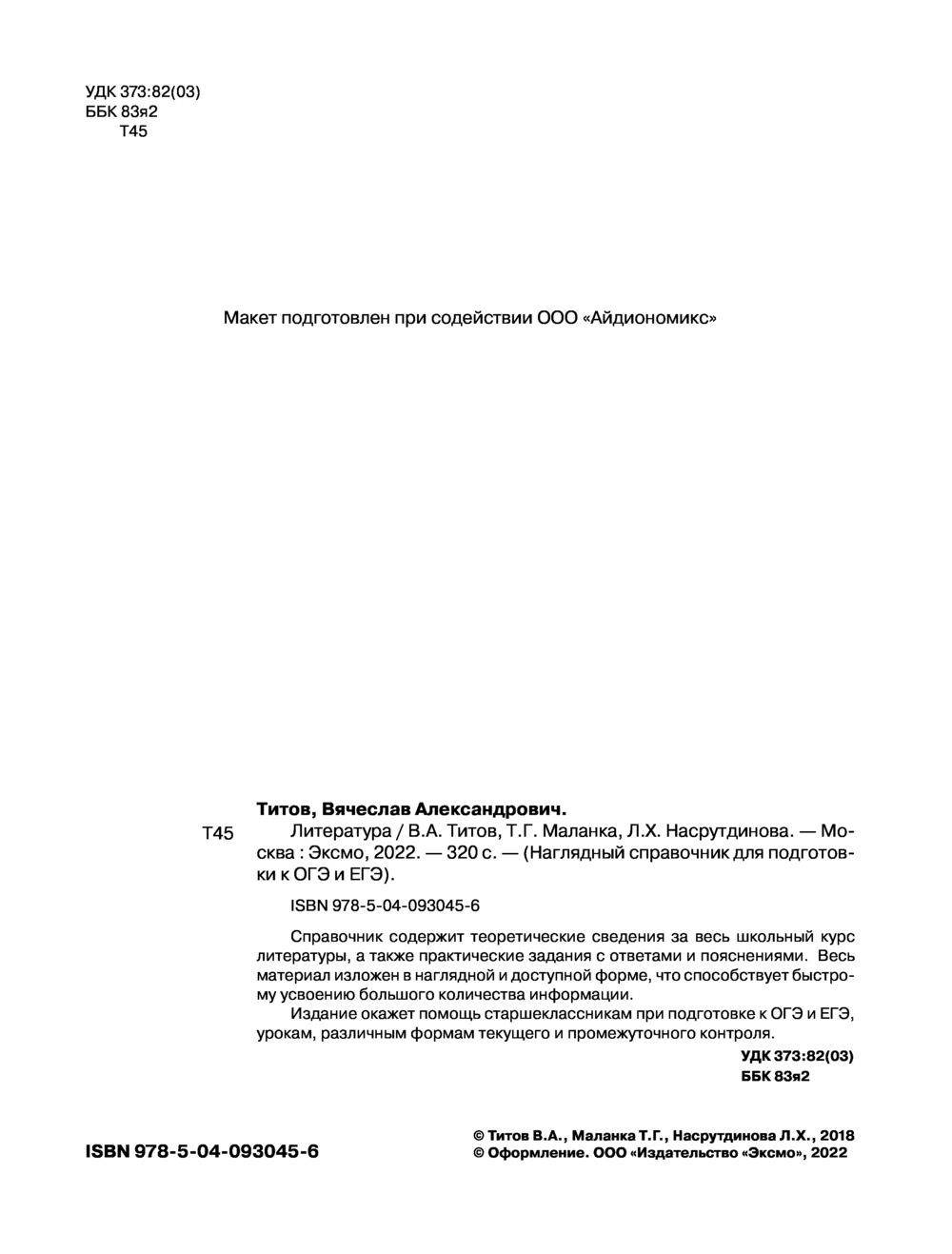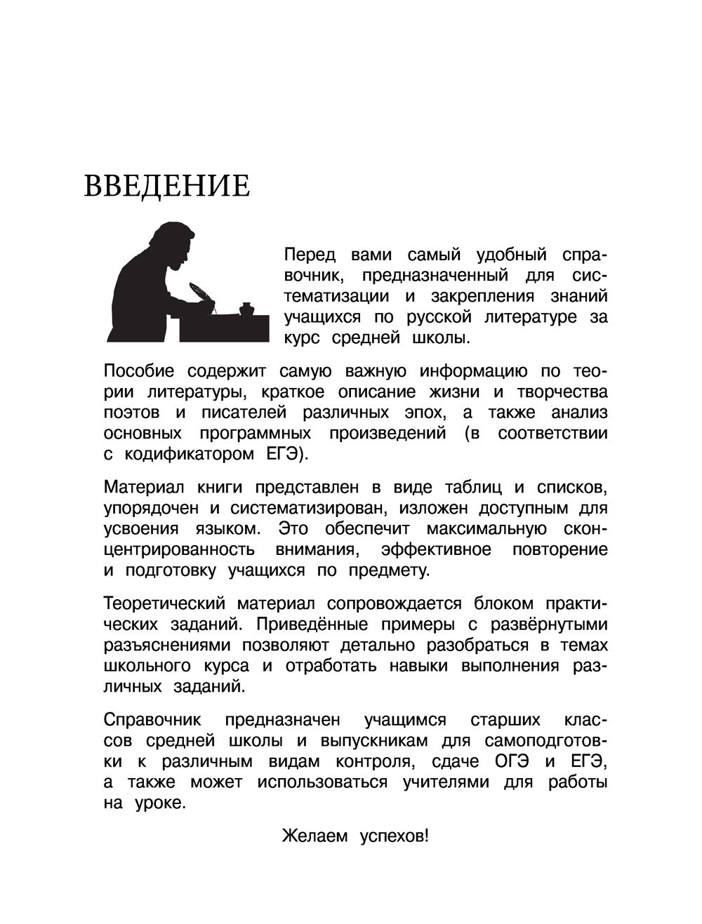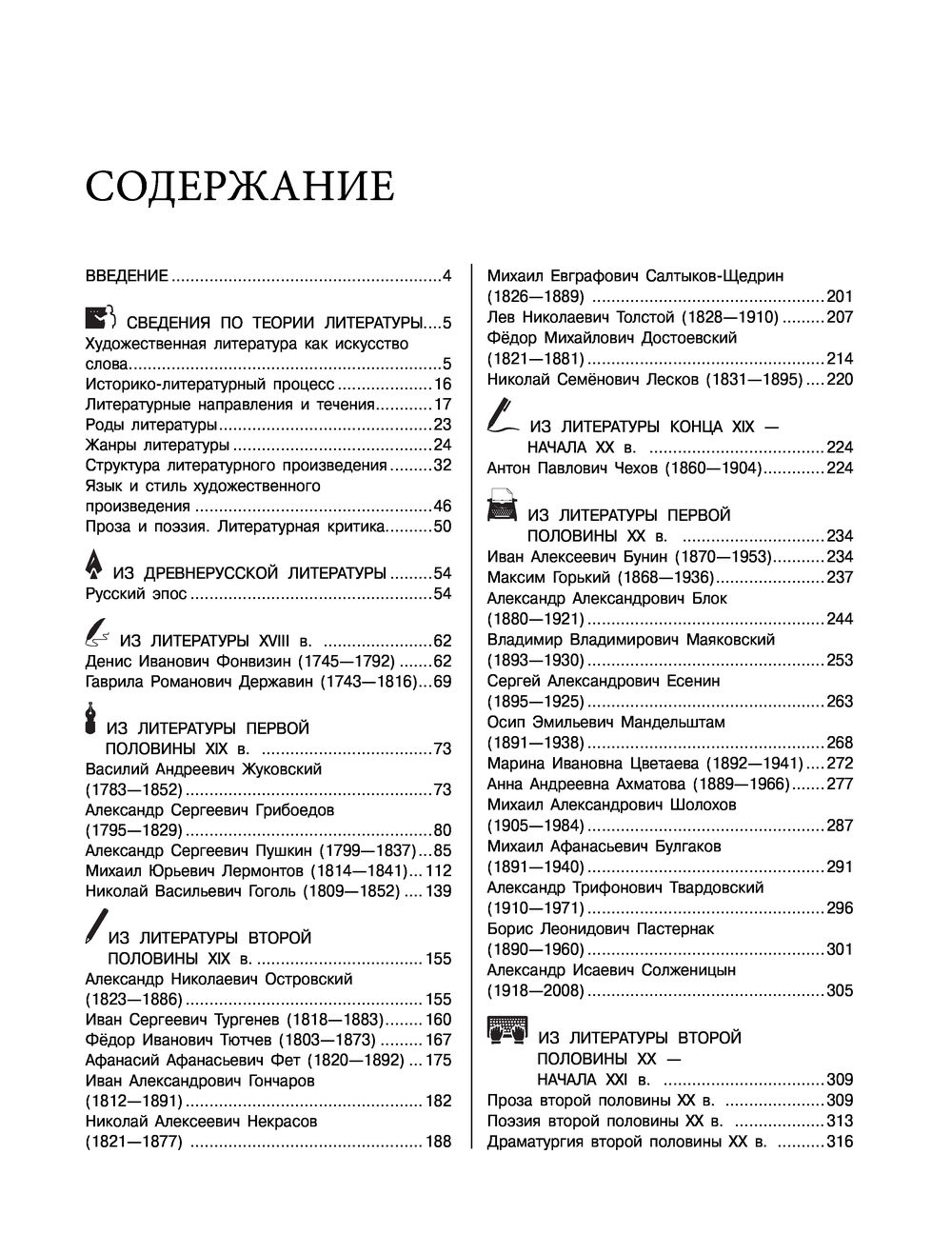 Справочник содержит теоретические сведения за весь школьный курс литературы, а также практические задания с ответами и пояснениями. Весь материал изложен в наглядной и доступной форме, что способствует быстрому усвоению большого количества информации. Издание окажет помощь старшеклассникам при подготовке к ОГЭ и ЕГЭ, урокам, различным формам текущего и промежуточного контроля.