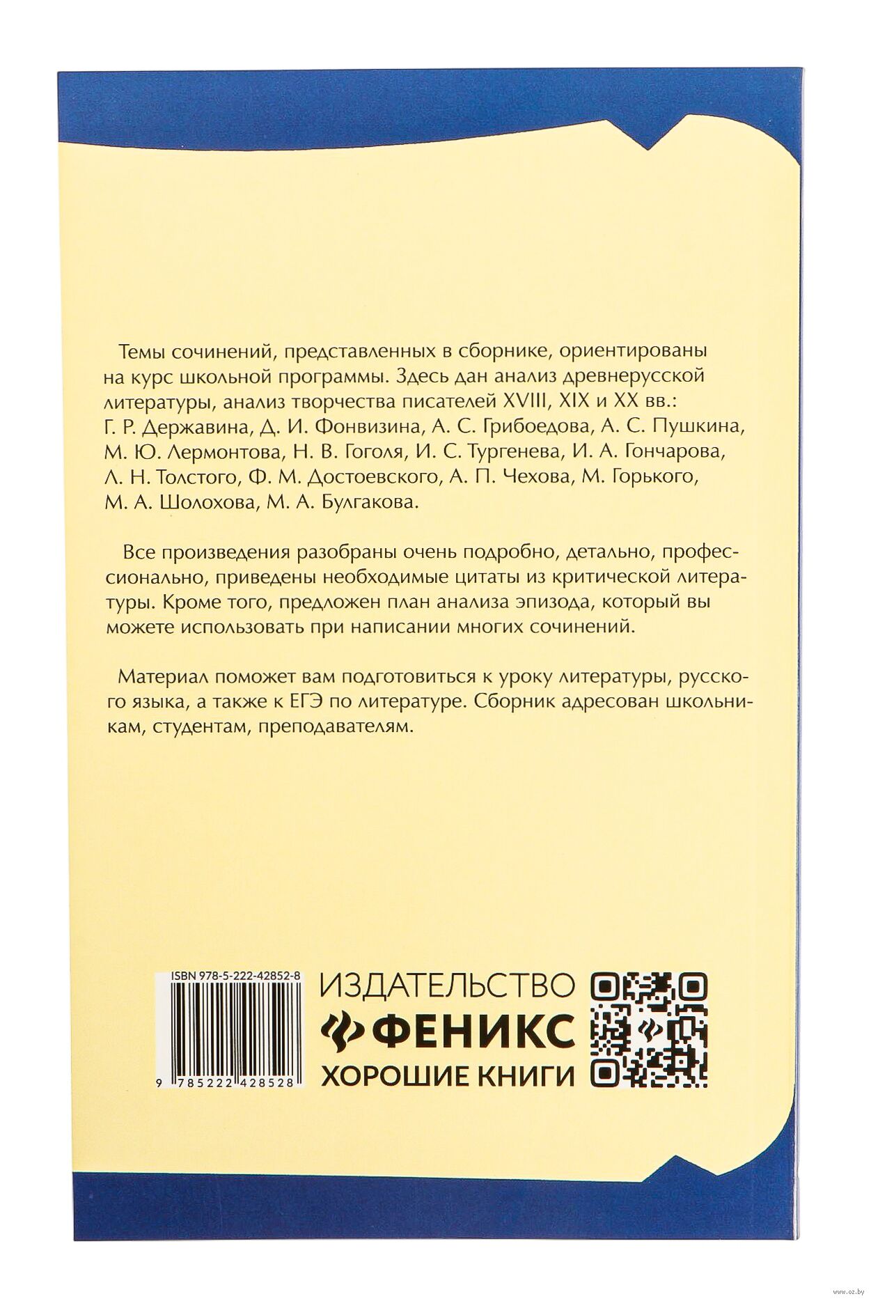 Сборник отличается широтой охвата материала и профессиональным литературоведческим подходом. Вы найдете различные виды сочинений: "Творческая история произведения", "Литературоведческое понятие", "Анализ эпизода", "Анализ образа", "Проблемный вопрос", "Авторская позиция" и т.д. Темы ориентированы на курс школьной программы. Здесь дан анализ древнерусской литературы, анализ творчества писателей XVIII, Х1Х и ХХ вв:: Г.Р. Державина, Д.И. Фонвизина, А.С. Грибоедова, А.С. Пушкина, М.Ю. Лермонтова, Н.В. Гоголя, И.С. Тургенева, И.А. Гончарова, Л.Н. Толстого, Ф.М. Достоевского, А.П. Чехова, А.М. Горького, М.А. Шолохова, М.А. Булгакова.