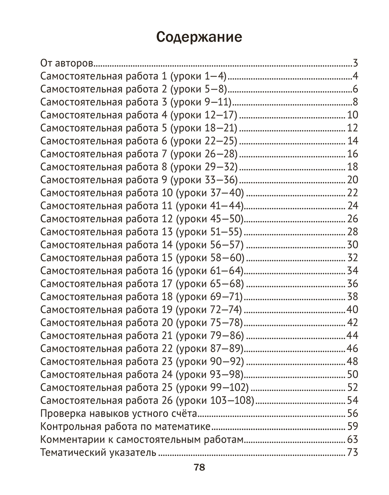 Пособие составлено в соответствии с учебной программой. Каждая тематическая самостоятельная работа представлена в одном варианте и относится к указанным в издании урокам учебника Г. Л. Муравьёвой, М. А. Урбан "Математика. 1 класс" (2024 г.). В конце тетради размещена контрольная работа для варианта 2.