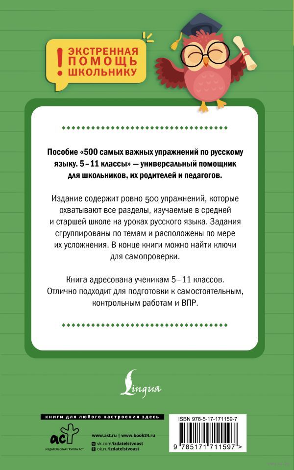 Данное издание содержит ровно 500 упражнений, которые охватывают все темы, изучаемые на уроках русского языка в средней и старшей школе: от правописания безударных гласных до пунктуации в сложных предложениях.