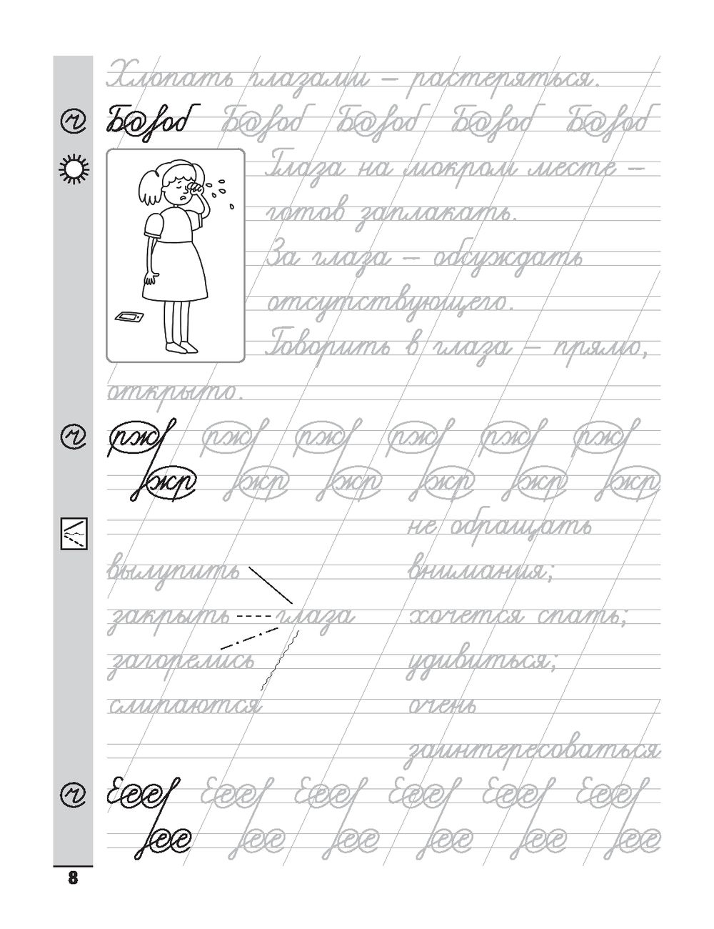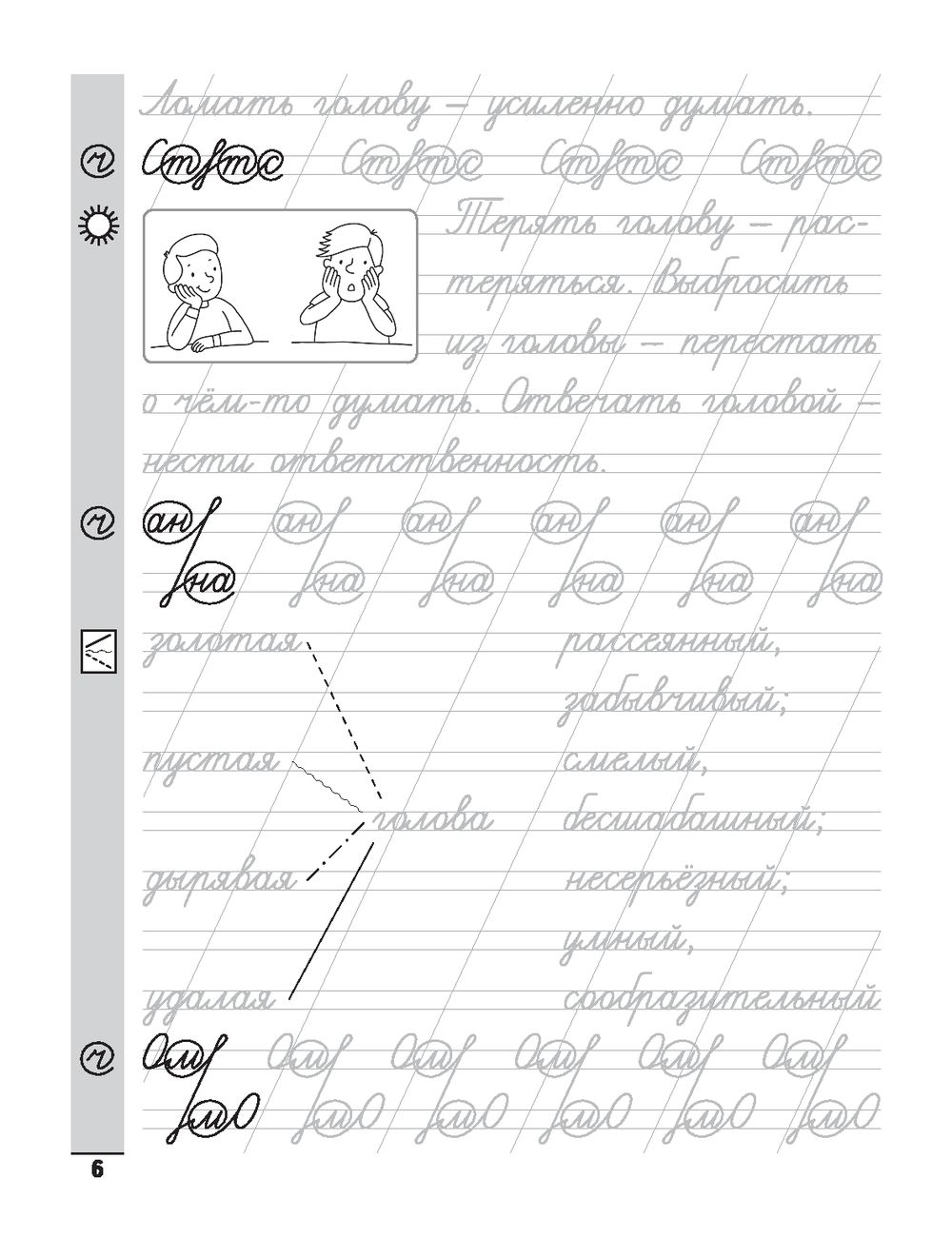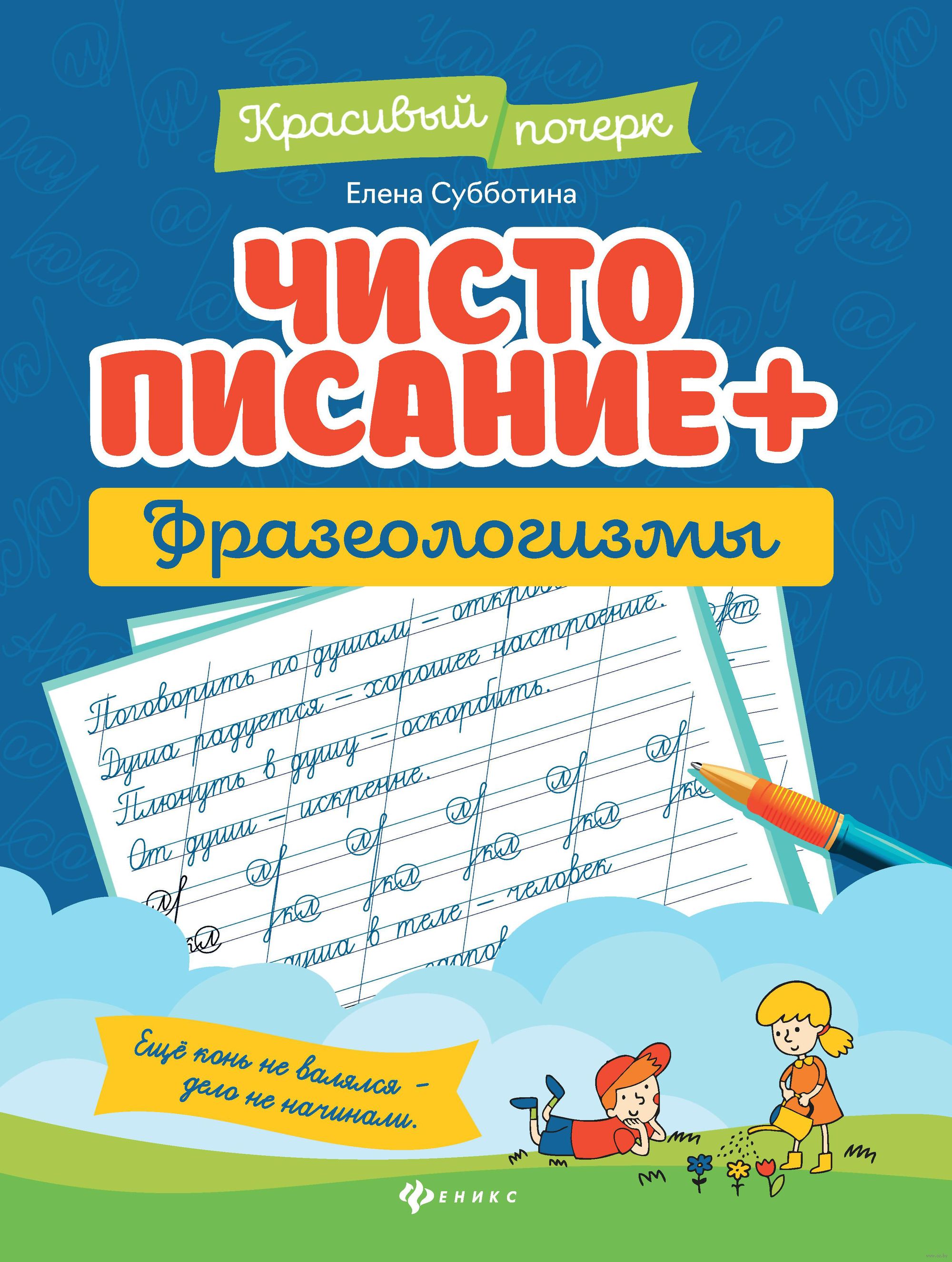 Перед вами тренажёр, в котором собрано более 260 фразеологизмов. Тексты и задания не только позволят потренироваться в классическом написании сложных элементов букв и росчерков, но и расширят, обогатят язык ребёнка. Увлекательные задания не дадут ребёнку заскучать и одновременно помогут развить мыслительные и логические навыки. А картинки можно раскрасить, если рука утомилась писать!