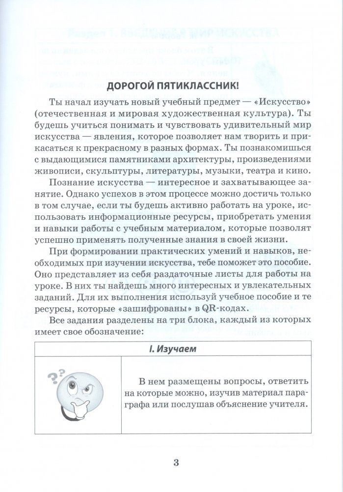 Пособие представлеяет собой раздаточные материалы для работы на уроках по учебному предмету "Искусство (отечественная и мировая художественная культура)" и включает практические и творческие задания по учебному материалу для 5-го класса. Их содержание соответствует учебной программе и пособию по предмету и позволяет сформировать у учащихся умения и навыки, необходимые для изучения искусства.