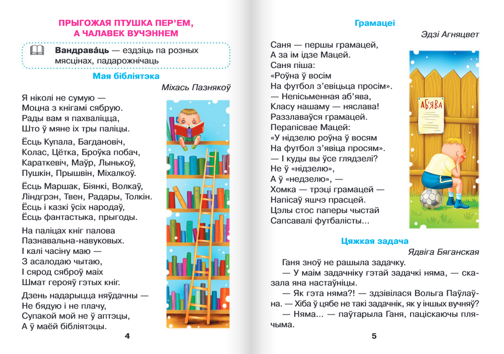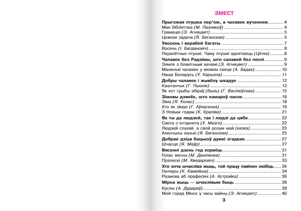 Дапаможнiк прызначаецца для пазакласнага чытання вучням у 3 класе. Матэрыял складзены ў адпаведнасцi з праграмай лiтаратурнага чытання для ўстаноў з беларускай і рускай мовамі навучання. Структура дапаможнiка адпавядае падручнiку "Лiтаратурнае чытанне".