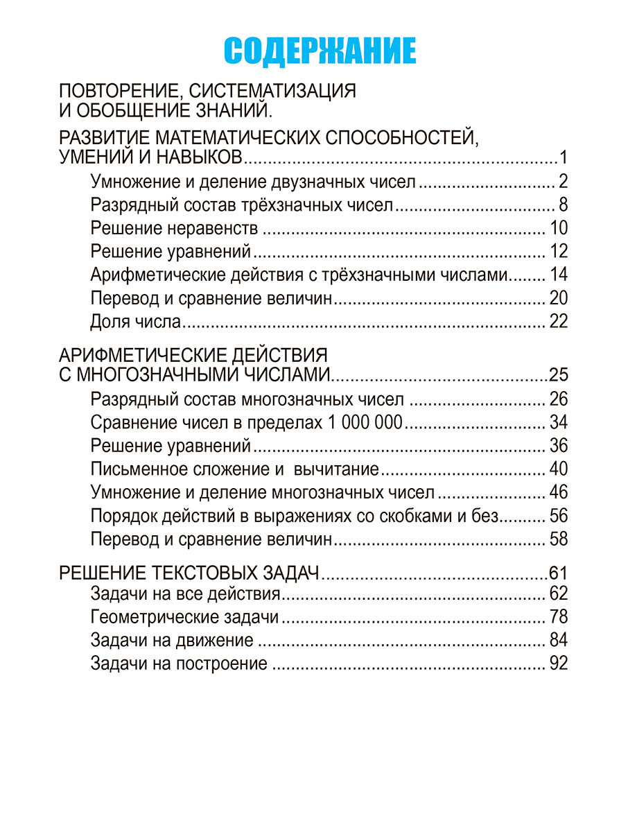Тренажёр предназначен для формирования важных математических умений четвероклассников. Специально подобранные упражнения помогут систематизировать и обобщить знания. В тетради предлагаются тренировочные задания и текстовые задачи различной сложности, которые направлены на развитие математических способностей и навыков. Тренажёр составлен в соответствии с образовательными стандартами и программой обучения математике в начальной школе и может быть использован как на уроках для организации индивидуальной и самостоятельной работы, так и на дополнительных занятиях дома.