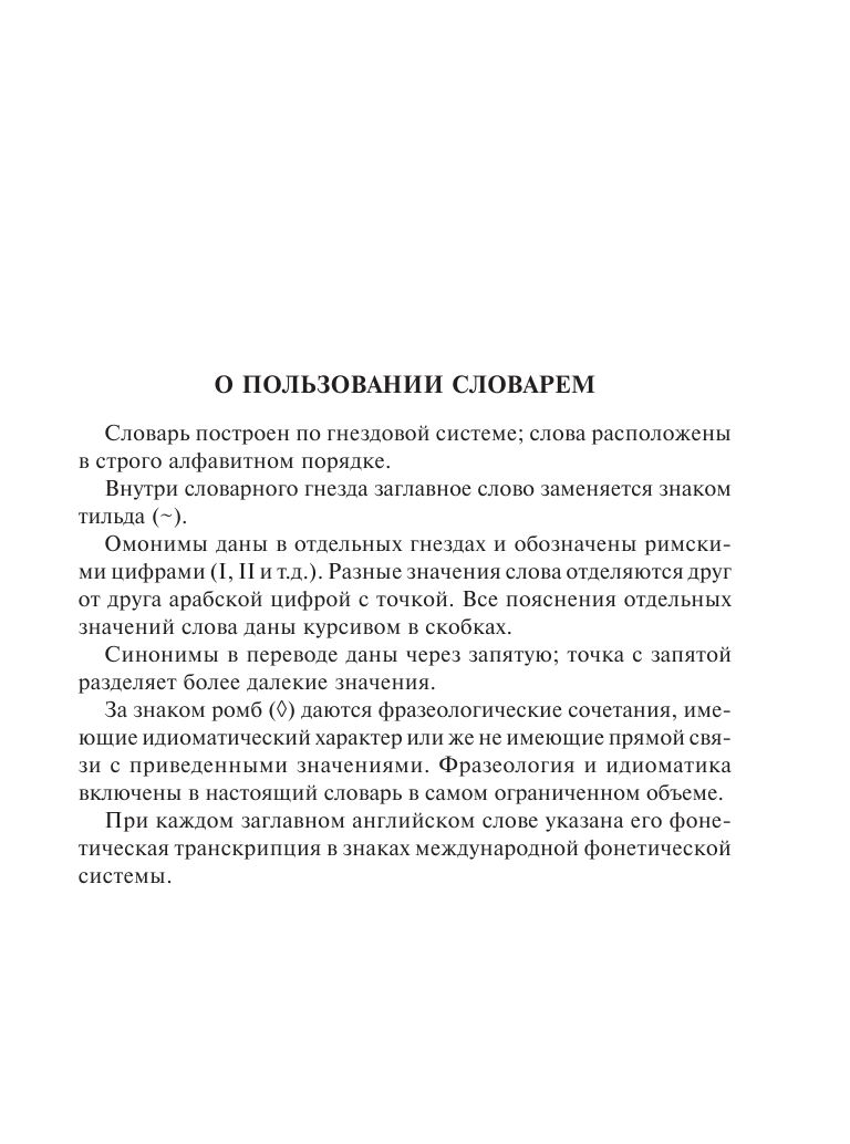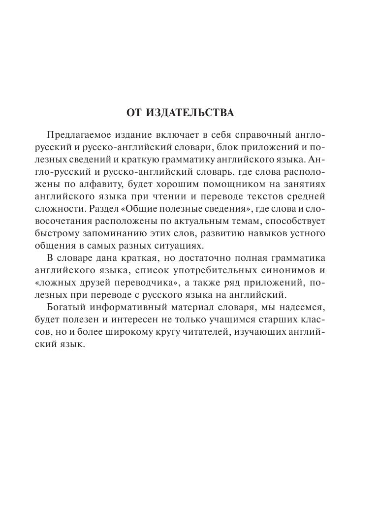 Этот современный словарь – незаменимый помощник для чтения и перевода текстов средней сложности, для пополнения активного словарного запаса пользователя. В него включены: англо-русский и русско-английский словари, краткая грамматика, список синонимов и антонимов и полезные фразы для общения.