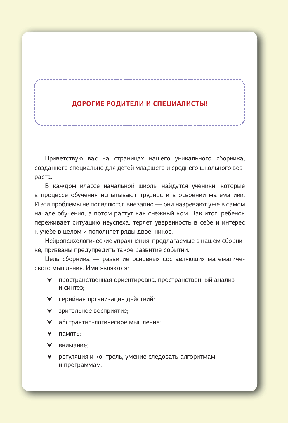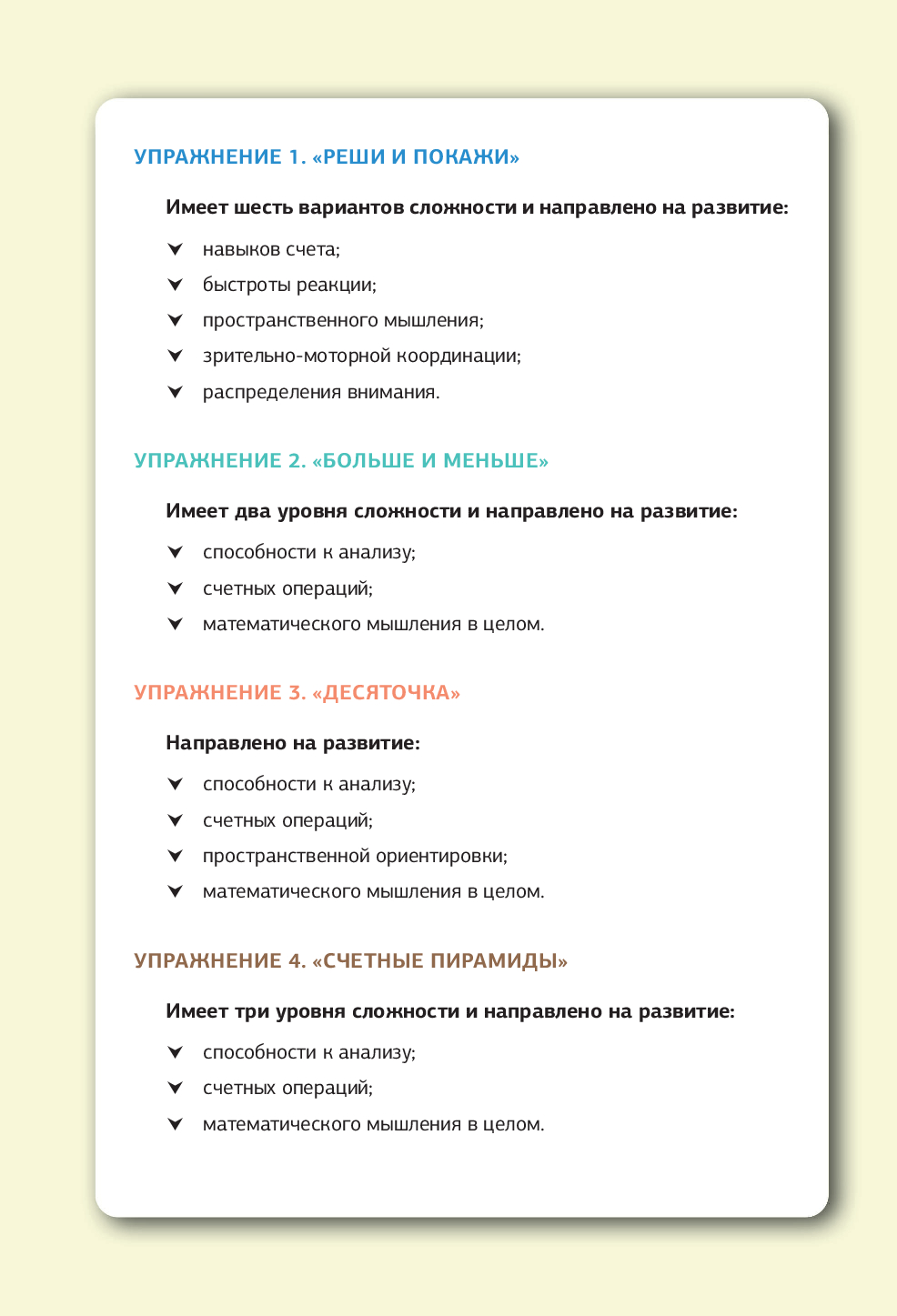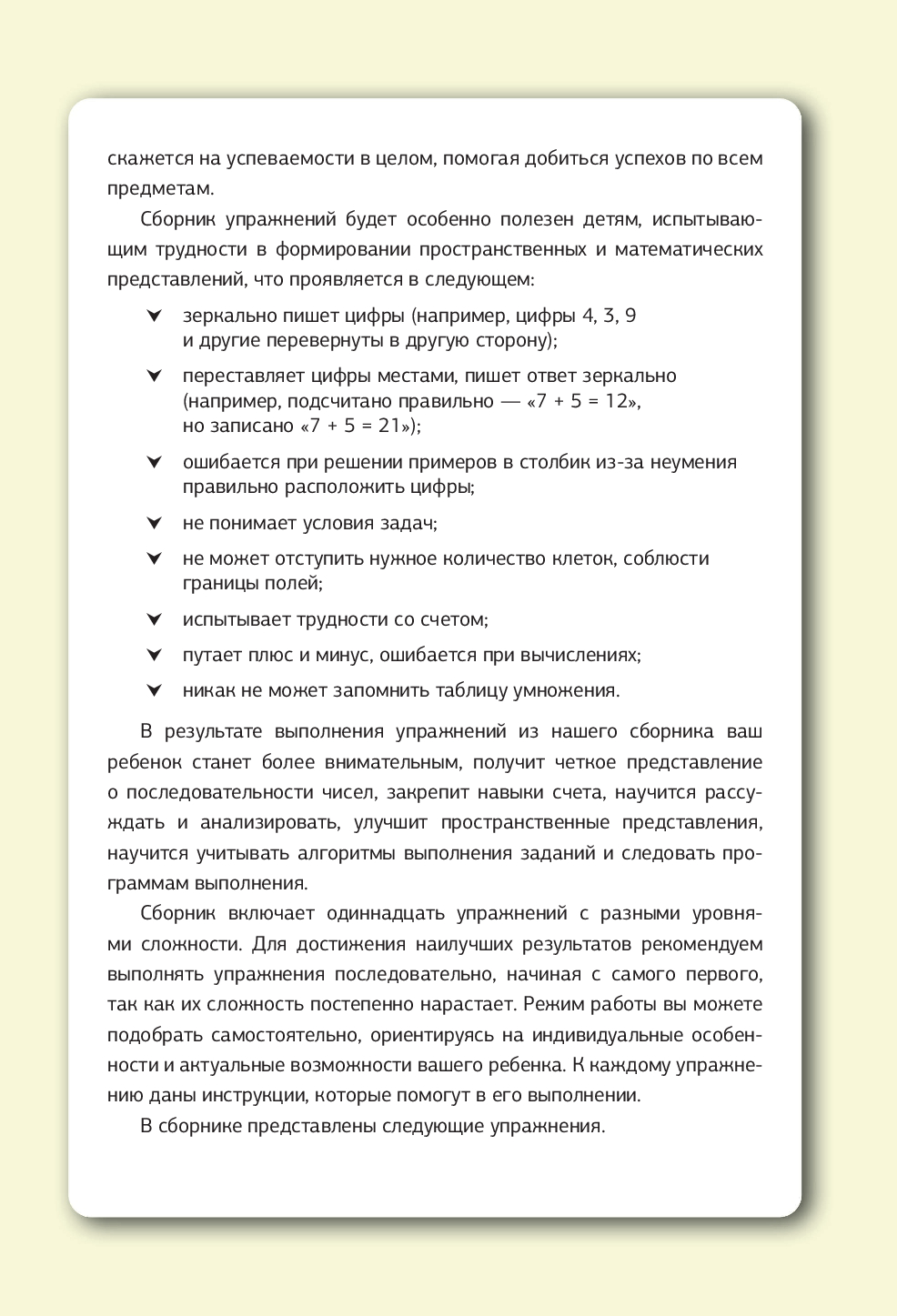 Тренажер подойдет для дошколят и младших школьников с разным уровнем подготовки. Сборник разработан для того, чтобы помочь детям развить математические способности и улучшить успеваемость в школе по всем предметам.