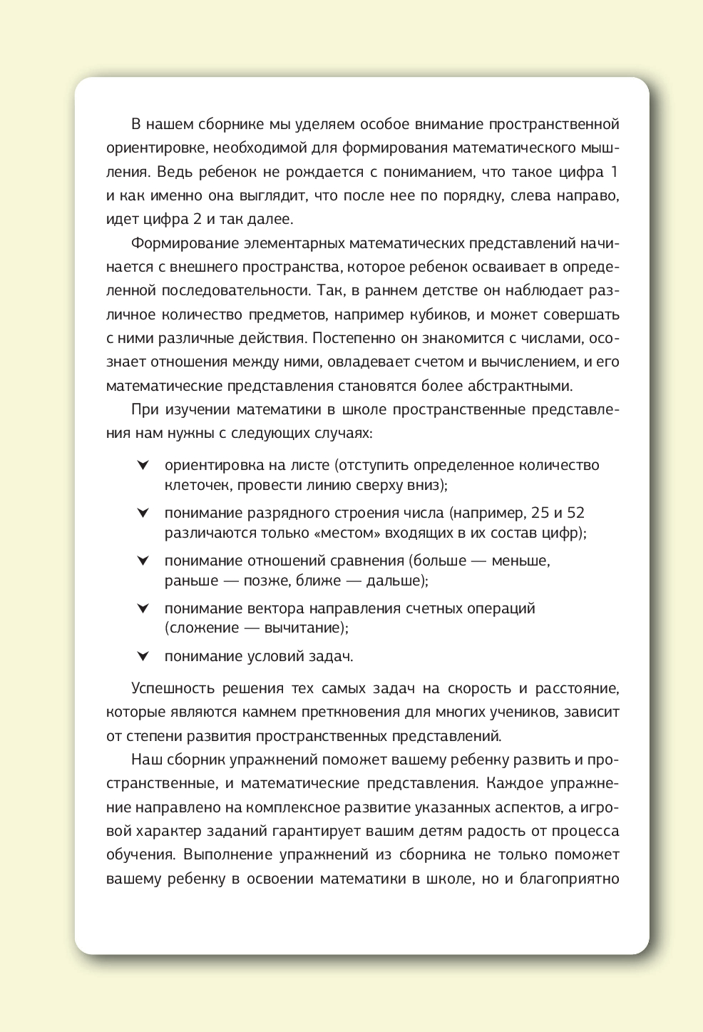 Перед вами рабочая тетрадь с нескучными заданиями по математике. Одиннадцать упражнений разного уровня сложности, направленных на развитие пространственных представлений, научат ребенка понимать порядок чисел, сравнивать их и выполнять счетные операции, решать задачи. Упражнения в игровой форме помогут родителю и ребенку весело и с пользой провести время вместе.