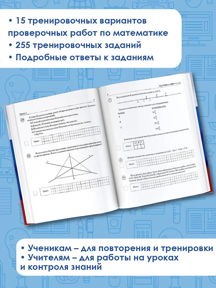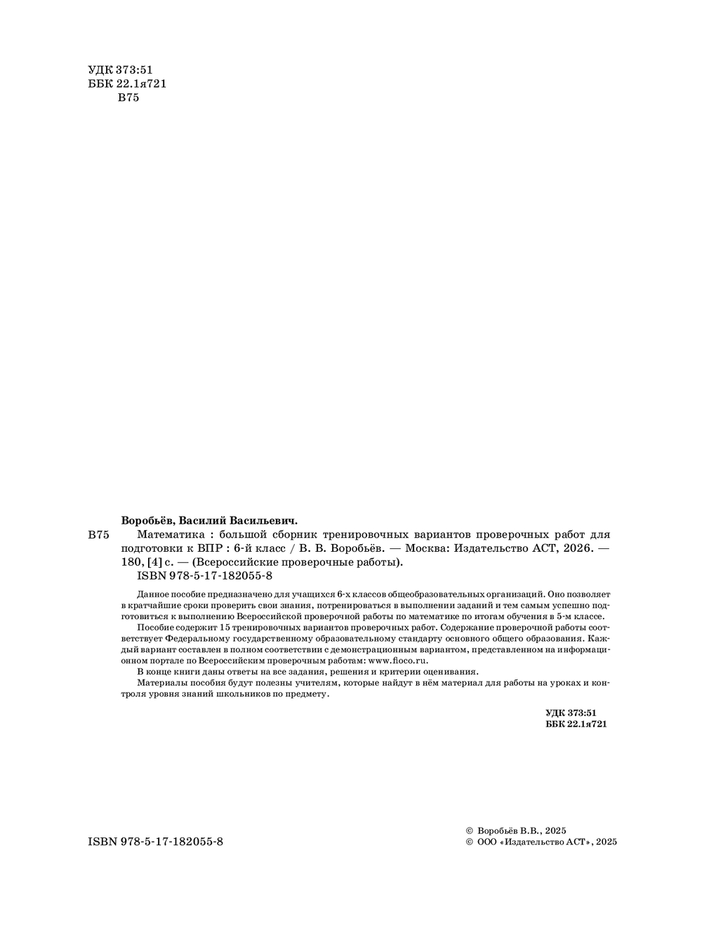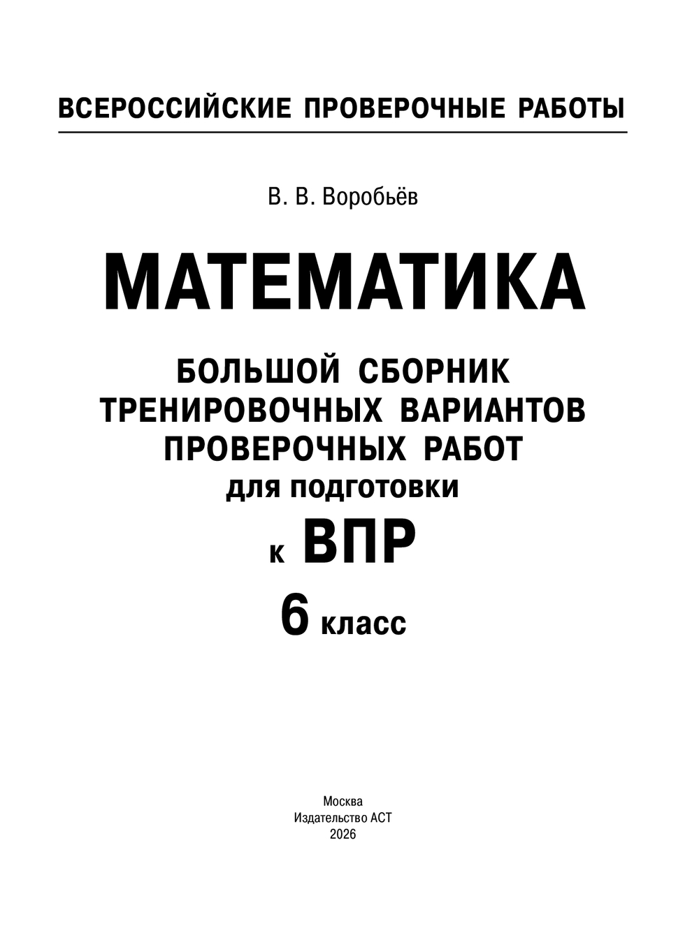 Данное пособие предназначено для учащихся 6-х классов общеобразовательных организаций. Оно позволяет в кратчайшие сроки проверить свои знания, потренироваться в выполнении заданий и тем самым успешно подготовиться к выполнению Всероссийской проверочной работы по математике по итогам обучения в 5-м классе.