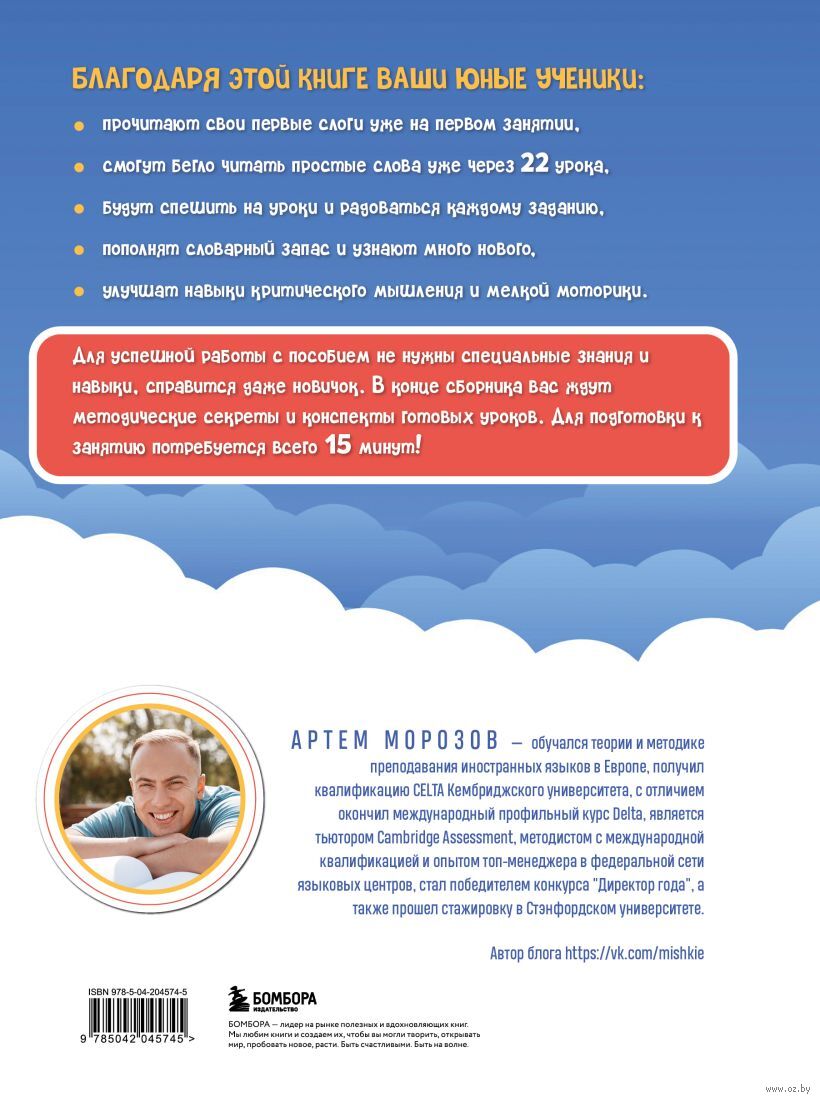 Ваш ребенок уже знает все буквы английского алфавита, но читать не получается? Более 110 тысяч педагогов и родителей уже доверяют авторской методике сертифицированного преподавателя с квалификацией CELTA Кембриджского Университета Артема Морозова, а юные ученики уже на втором уроке начинают складывать буквы в слоги с удовольствием.